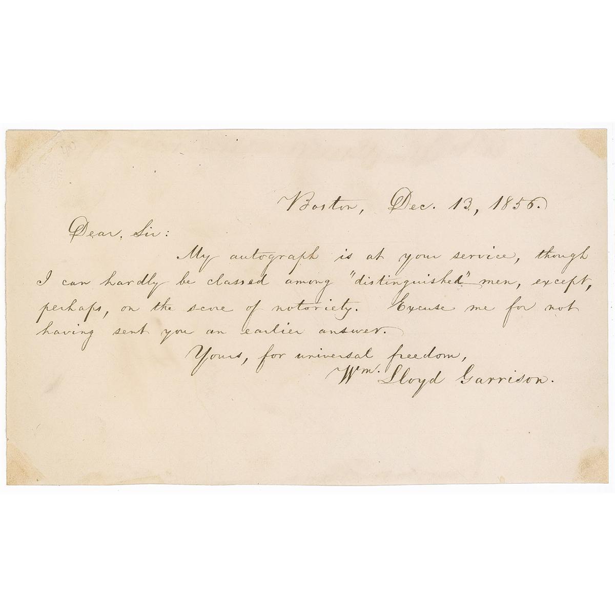 Journalist, editor, and social reformer (1805–1879) best known as one of the most ardent and influential abolitionists in the decades leading up to the Civil War. ALS signed “Wm. Lloyd Garrison,” one page, 7.75 x 4.5, December 13, 1856. Garrison responds to an autograph request. In full: “My autograph is at your service, though I can hardly be classed among ‘distinguished’ men, except, perhaps, on the score of notoriety. Excuse me for not having sent you an earlier answer. Yours, for universal freedom.” In very good condition, with two vertical folds, one passing through the signature, a tiny hole beneath one word, and edge and corner soiling from past mounting.