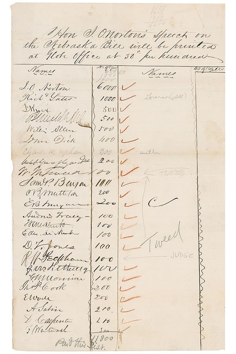 Politician (1823-1878) most notable for being the ‘boss’ of Tammany Hall, the Democratic Party political machine that played a major role in the politics of 19th century New York City and State. DS, signed “W. M. Tweed,” one page, 8 x 12.75, no date. Tweed, along with 23 others, orders 100 copies of “Hon. John Norton’s speech on the Nebraska Bill.” In very good condition, with a central horizontal fold under Tweed’s signature, scattered toning and soiling, and several pencil notations.