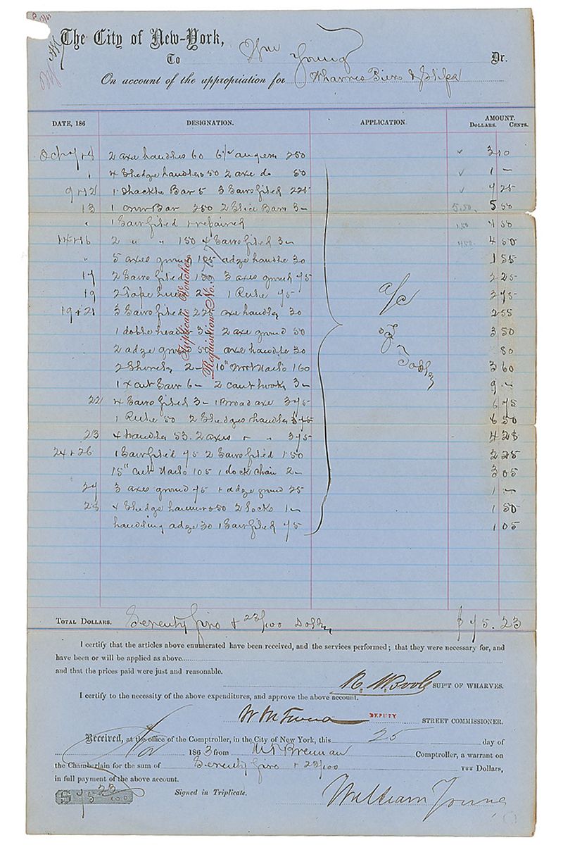 Politician (1823–1878) most notable for being the ‘boss’ of Tammany Hall, the Democratic Party political machine that played a major role in the politics of 19th century New York City. Partly-printed DS, signed “W. M. Tweed,” one page, 8.5 x 13.75, November 25, 1863. Receipt for a payment of $45.23 for a large purchase of supplies including “21 axe handles,” “1 shackle bar,” “2 shovels,” and “4 sledge hammers.” Signed at the bottom by Tweed as deputy street commissioner. Tape-repaired partial separation to one storage fold, light toning, and a small area of paper loss to upper left corner, otherwise fine condition.