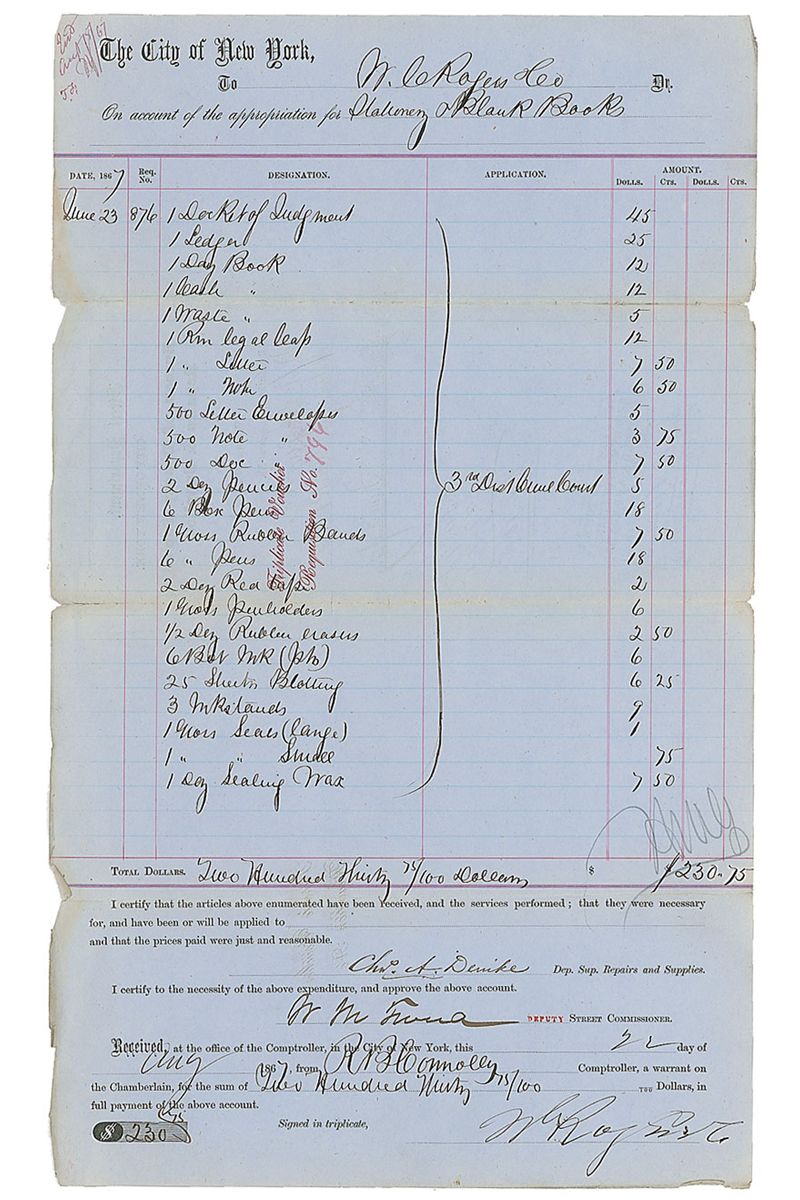 Partly-printed DS, signed “W. M. Tweed,” one page, 8.25 x 14, August 22, 1867. Receipt for a payment of $230.75 for a purchase of office supplies for New York’s 3rd District General Court, including: “1 Ledger,” “1 Day Book,” “500 Letter Envelopes,” “1 Gross Rubber Bands,” “25 Sheets Blotting,” and “1 Doz Sealing Wax.” Moderate creases and wrinkling to left edge and partial separations to horizontal storage folds, otherwise fine condition.