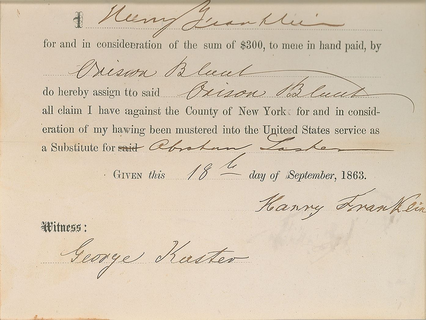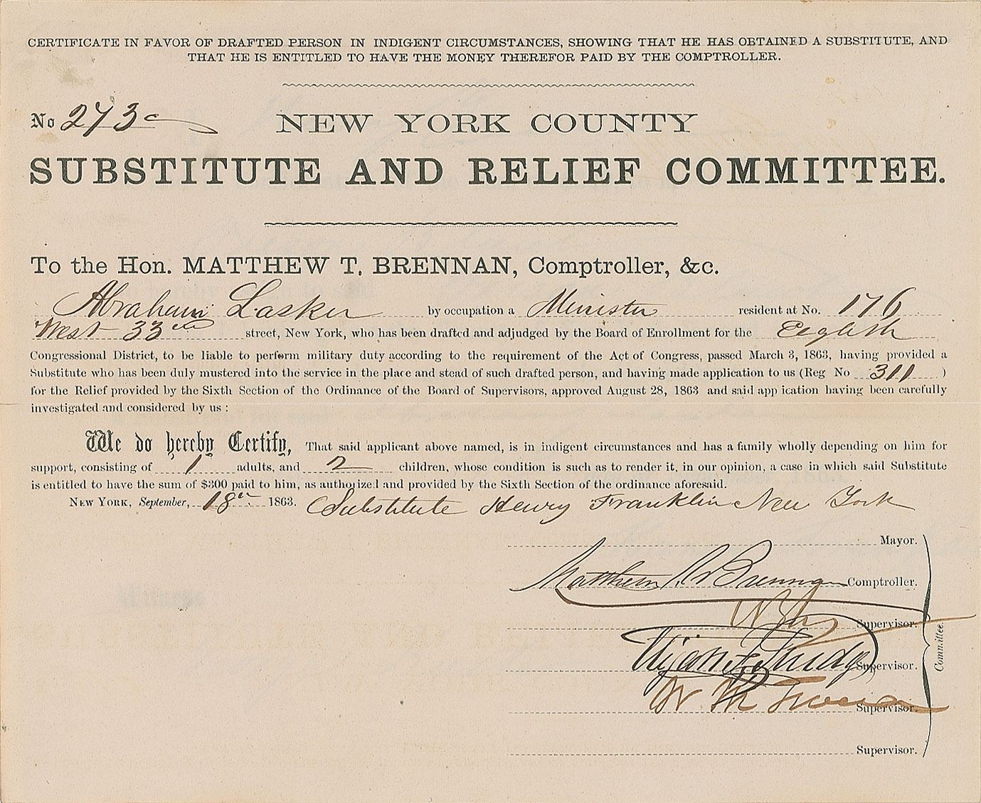 Civil War–dated partly-printed DS, signed “W. M. Tweed,” one page, 8.5 x 7, September 18, 1863. Document issued by the "New York County Substitute and Relief Committee," being a "Certificate in favor of Drafted Member in Indigent Circumstances, showing that he has obtained a Substitute and that he is entitled to have the Money therefore paid by the Comptroller." As a committee supervisor, Tweed certifies that one Abraham Lasker, a minister, "is in indigent circumstances and has a family wholly depending on him for support." The document names Moran's substitute as “Henry Franklin”; a receipt signed by Franklin is affixed along the top edge. Signed at the conclusion by committee members William M. Tweed, Matthew T. Brennan, and two others. In fine condition.