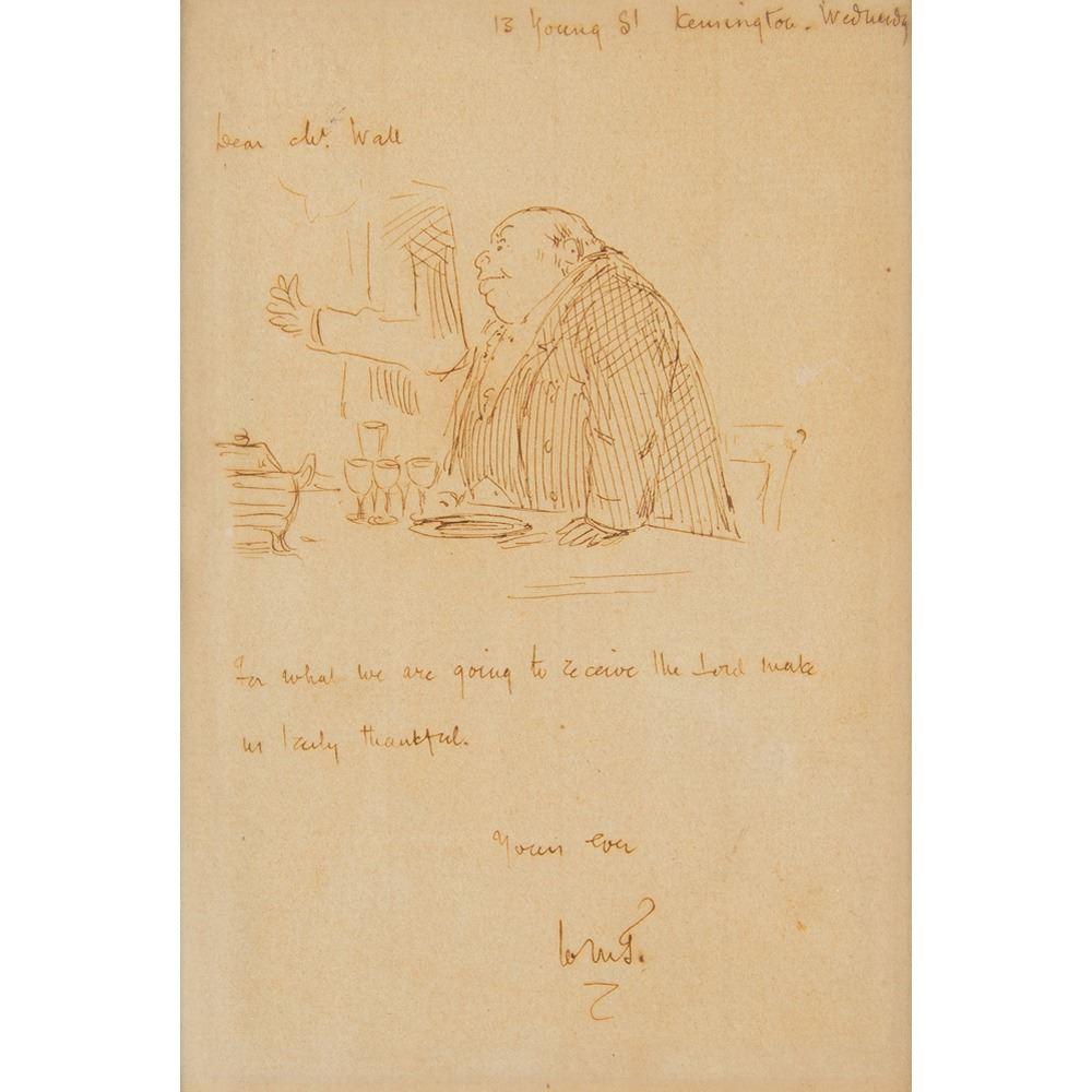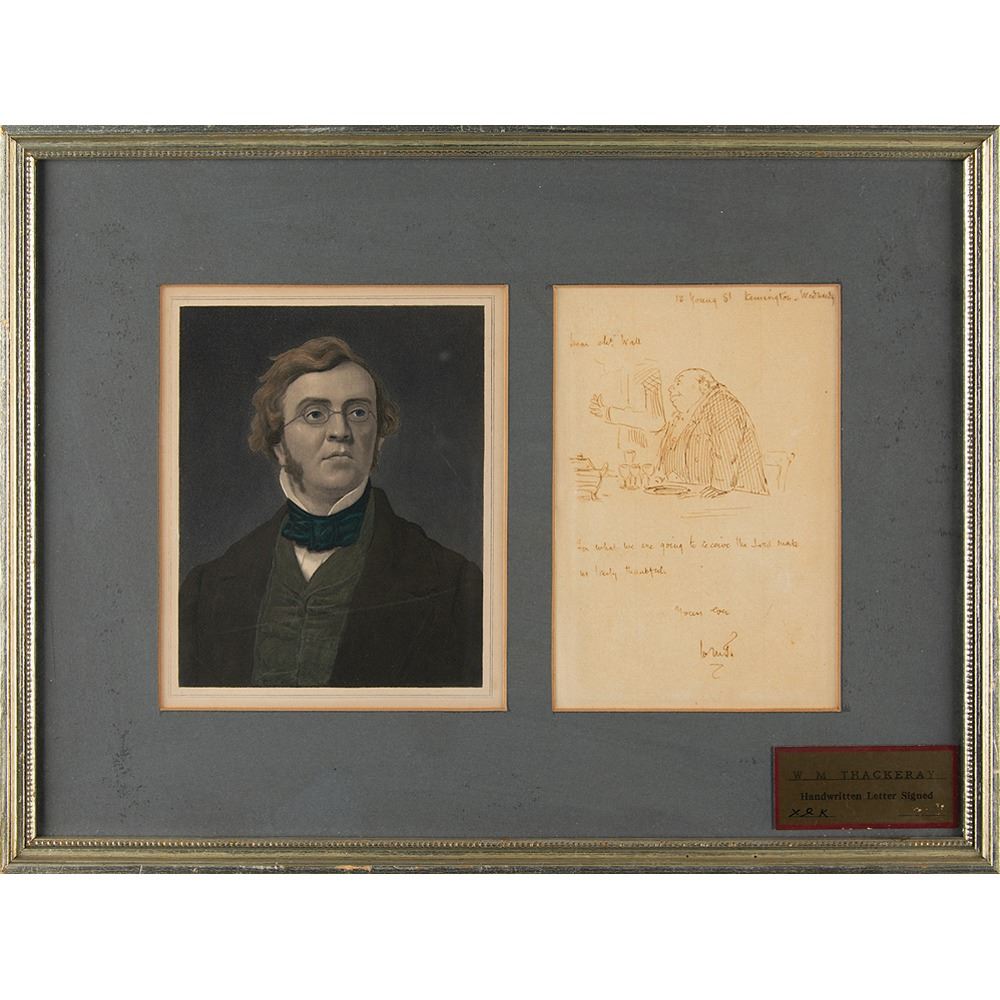 ALS with sketch, signed “WMT,†one page, 4 x 6, no date. Handwritten note to "Mr. Wall," in full, "For what are we going to receive the Lord make us truly thankful," with a large and detailed sketch of a dinner scene above. Matted and framed with a portrait to an overall size of 14.25 x 10.75; the backing bears an affixed Charles Hamilton Autographs certificate of authenticity and red wax seal. In fine condition.