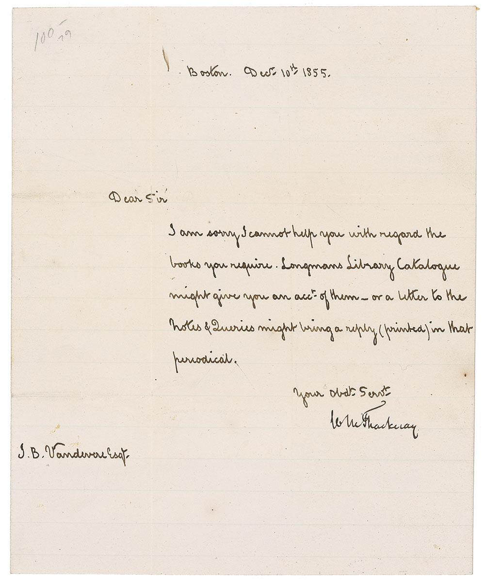 Well-regarded British novelist (1811–1863) of such satirical classics as Vanity Fair and The Luck of Barry Lyndon. ALS signed “W. M. Thackeray,” one page, lightly-lined, 6.75 x 8, December 10, 1855. Letter of assistance to J. B. Vandevere. In full: “I am sorry I cannot help you with regard the books you require. Longmans Library Catalogue might give you an acct of them—or a letter to the Notes & Queries might bring a reply (printed) in that periodical.” In fine condition, with intersecting folds, a bit of mild toning, and pencil notation to top edge. Pre-certified PSA/DNA and RRAuction COA.