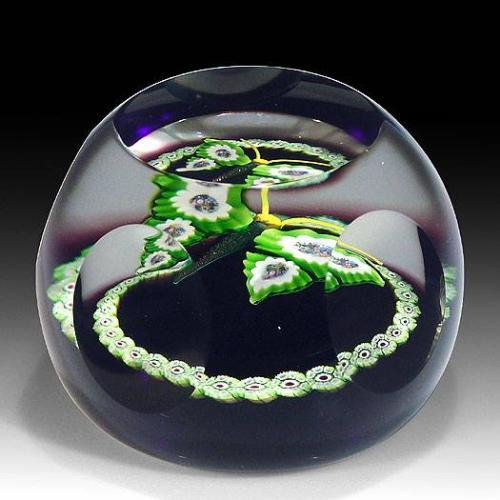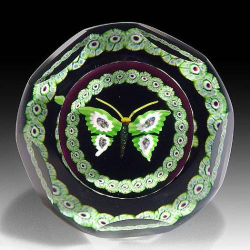 William Manson 1981 millefiori butterfly paperweight. Green and white butterfly with aventurine body floating over black ground, encircled by green and white millefiori garland. One-and-five facets. Limited edition of 150, edition number 85. Signature cane. Dated. Diameter 3". Donated by: John B. Walsh.<p>Proceeds from the auction will go to benefit Santa Cruz, California glass artist Steven Lundberg, who, after 30 years of blowing glass locally, was diagnosed with amyotrophic lateral sclerosis, or ALS (Lou Gehrig's disease). This auction is a fundraising effort to help Steve meet the challenges of this disease.<p>Costs of treating ALS over a period of time can be exorbitant. In the short-term, Steve needs basic equipment such as an electric scooter and pointing devices to help him read and write.<p>Please join us for this auction, and help support a friend. Check out our other auctions to see the 150 paperweights, vessels, and glass sculptures from internationally known glass artists, donated by generous artists, galleries, and glass collectors from all over the country. Please contact us at 1-800-538-0766 or (831) 427-1177 for more information, or see <a href=http://www.selman.com/press target=_blank>www.selman.com/press</a>.