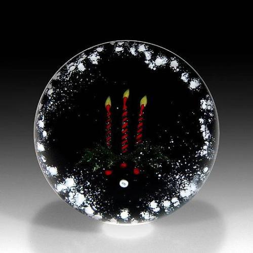 William Manson, Sr. 2002 Christmas candles paperweight. A centerpiece, with three red candles, green aventurine holly leaves, and red berries, rests on black ground, which is dusted with white snow at the perimeter. Signature cane. Signed/dated. Edition #6 of a limited edition of 50. Diameter 2 7/8".