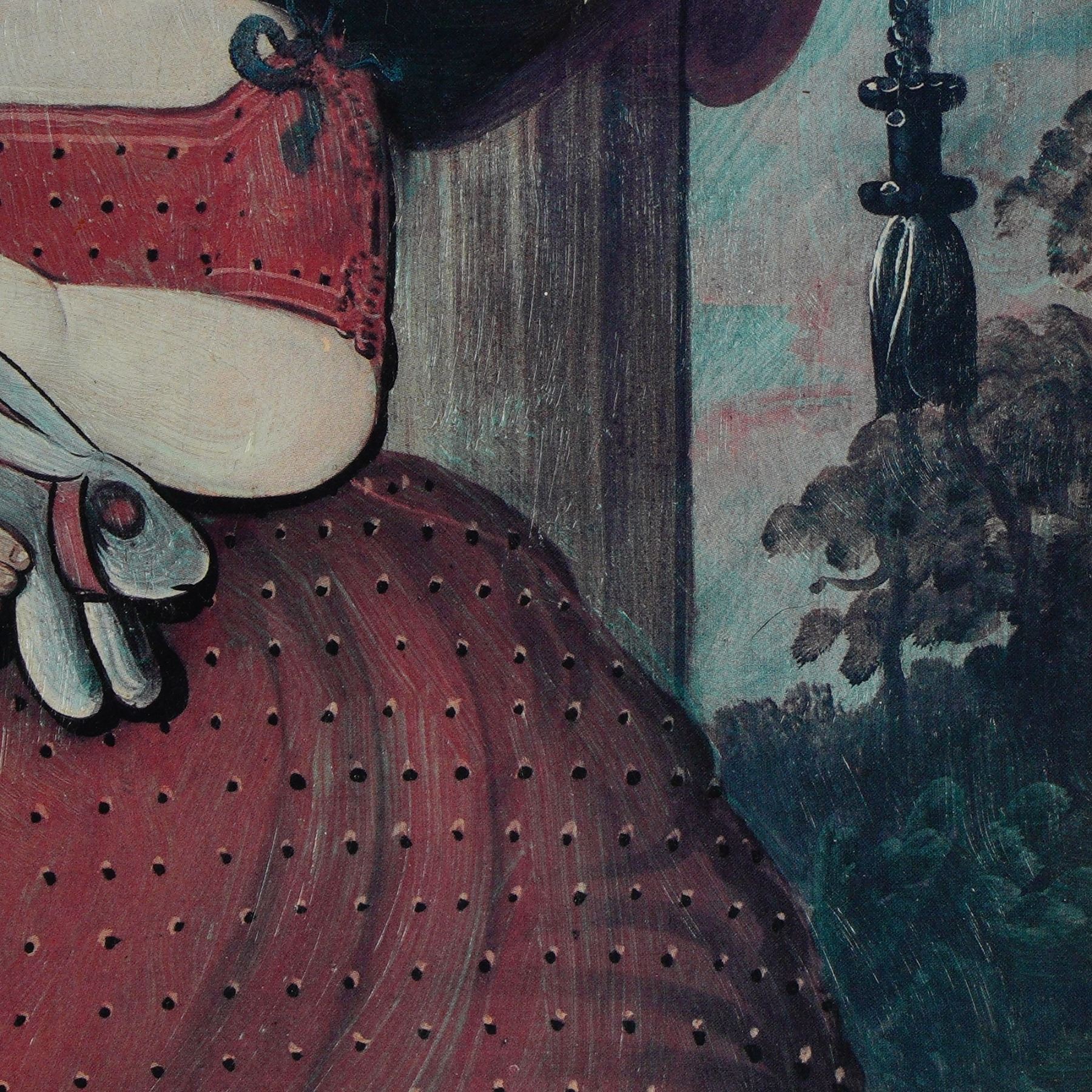 American School, after William Matthew Prior. This work, executed with added tinted varnish on print board, is a vibrant rendition of Prior's well-known composition Little Miss Fairfield, originally painted in 1850. The charming portrait depicts a young girl in a crimson polka-dotted dress, holding a toy rabbit, with a dramatic dark backdrop and glimpses of verdant landscape. The piece captures the bold outlines and direct gaze characteristic of Prior's American folk portraiture. Presented in a period-style wooden frame, this example reflects the enduring appeal of 19th-century American portraiture and the decorative practice of reproducing celebrated works for wider enjoyment.