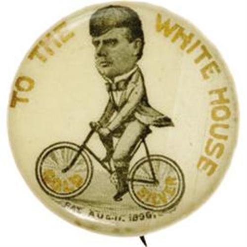 <B>William McKinley: A Classic Design showing McKinley Riding a Bicycle to the White House.</B></I> This 7/8" 1896 button is one of the more popular "cartoon" designs among collectors. Overall appearance is great. For accuracy, we note several light fox marks at the bottom edge and one vertical striation line in the celluloid, to McKinley's right. But, all in all, a superior example.<BR><BR><b>Shipping:</b> Small Flat (<a target="_blank" href="http://www.heritageauctions.com/common/shipping.php">view shipping information</a>)