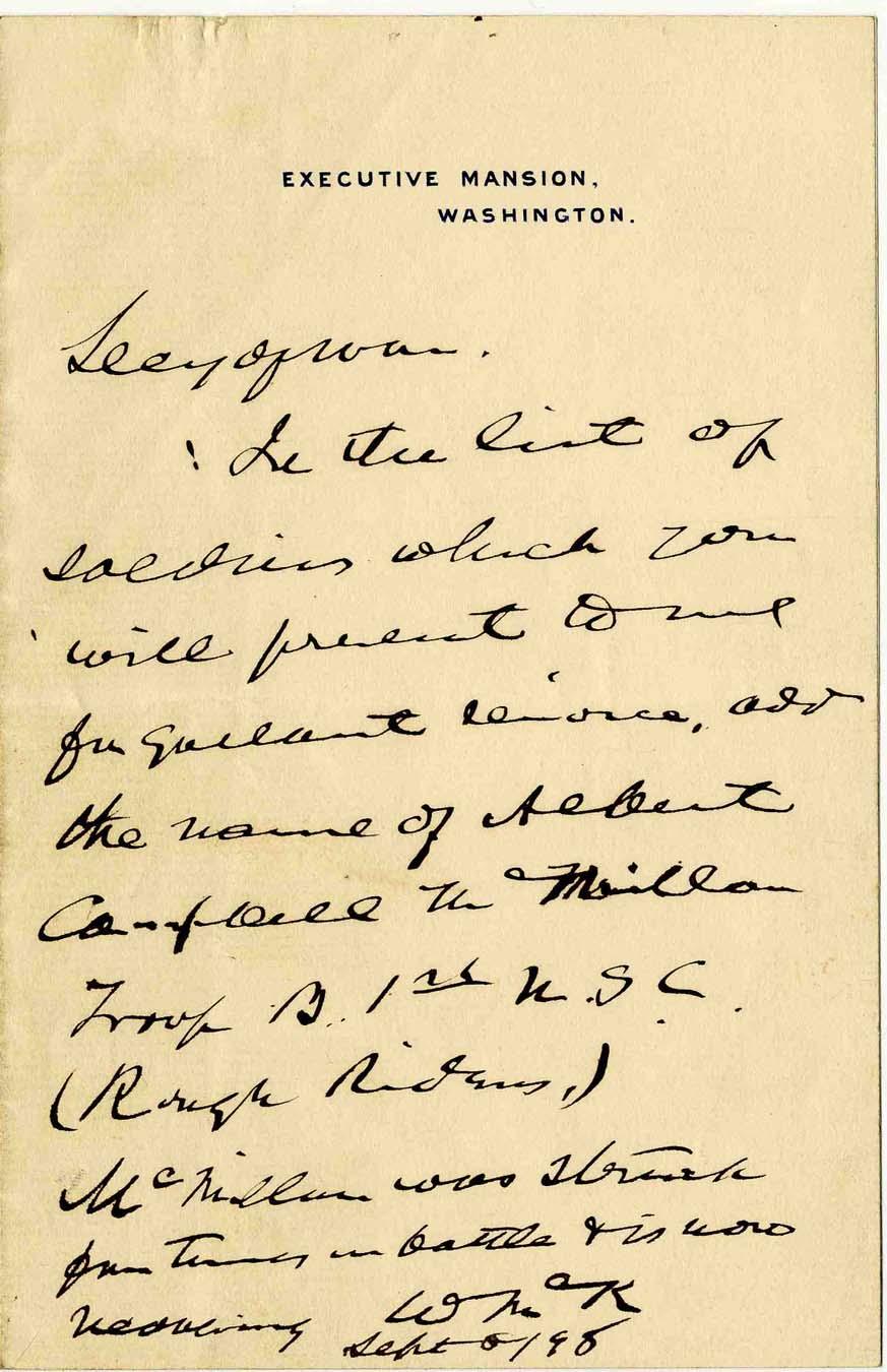 William McKinley autograph letter signed as President on Executive Mansion stationery, dated September 1898. Letter, addressed to the Secretary of War reads in part, ''…the list of soldiers which you will present to me for gallant service, add the name of Albert Canfield…Troop B 1st U.S.C. (Rough Riders,) McMillen was struck…in battle and is wounded…WMcK''. Letter, measuring 4.5'' x 7'', is in near fine condition. Accompanied by gorgeous red leather clamshell case.