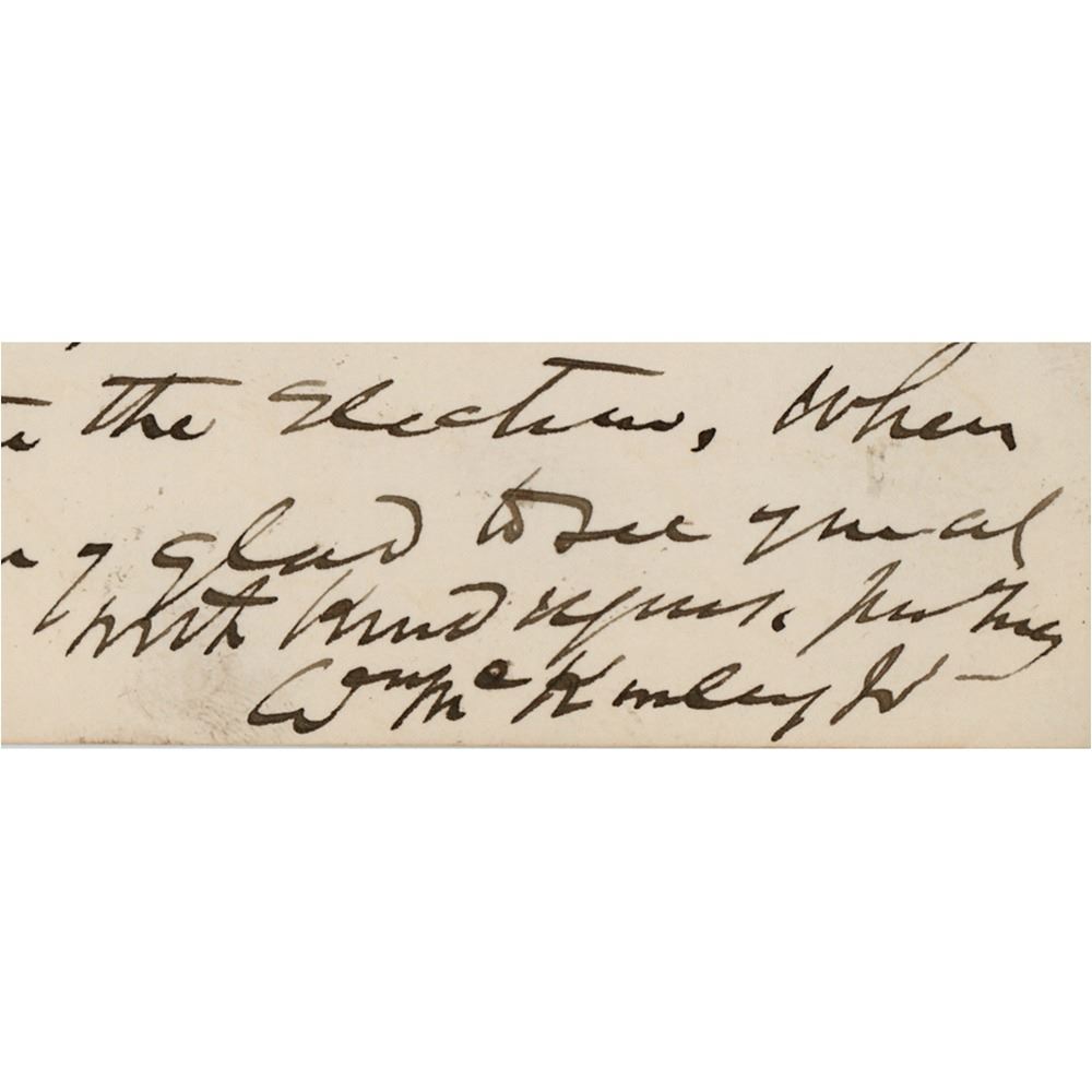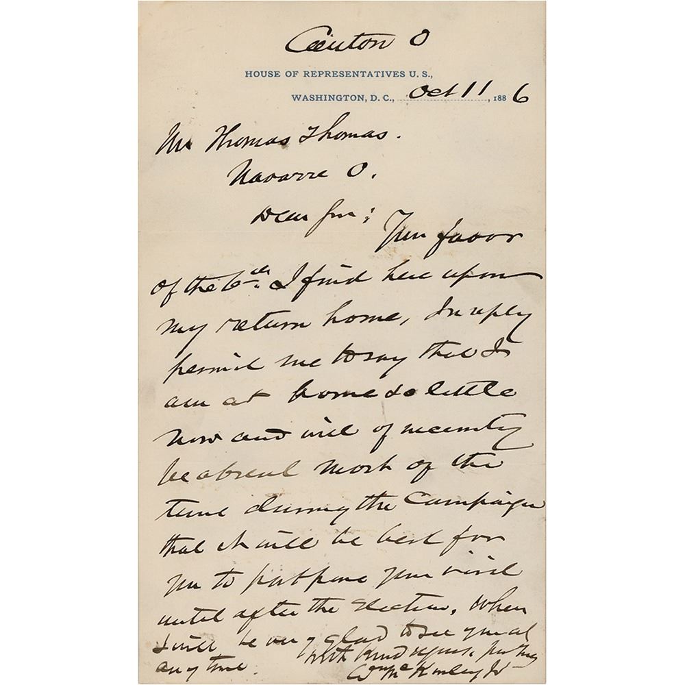 ALS signed "Wm. McKinley Jr.," one page, 5.25 x 8.75, House of Representatives letterhead, October 11, 1886. Handwritten letter to Thomas Thomas, in part: "Permit me to say that I am at home so little now and will of necessity be abroad most of the time during the campaign that it will be best for you to postpone your visit until after the election, when I will be very glad to see you at any time." In fine condition.