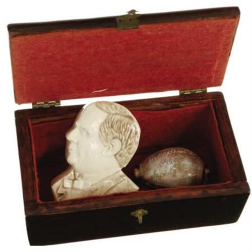 <B>William McKinley: An Interesting Pair of Display Items:</B></I> <BR><B>Glazed Plaque.</B></I> A most unusual, detailed glazed plaque in the form of his profile, with his name in relief at the bottom. Measures 3" x 4" and nearly 1" thick, much more massive than any similar tiles we have encountered from that era. Incised on the underside: "J.C. Williams, June 30 1904, LHW". <BR><B>Large Cowrie Shell Cameo.</B></I> The spotted outer layer has been removed, and then the under-layers have been carefully cut away to leave in relief lettering "WM. McKinley, Shot Sept. 6, Died Sept. 14, 2:15 am, 1901". Length: 2.75" <BR>Both are in beautiful condition and accompanied by a vintage wood chest with brass clasp measuring 7.5" x 3.25", in which they were found. <BR><BR><b>Shipping:</b> Miscellaneous Collectibles, Smal (<a target="_blank" href="http://www.heritageauctions.com/common/shipping.php">view shipping information</a>)
