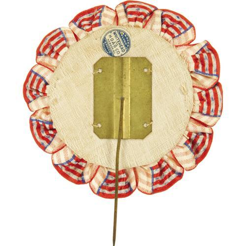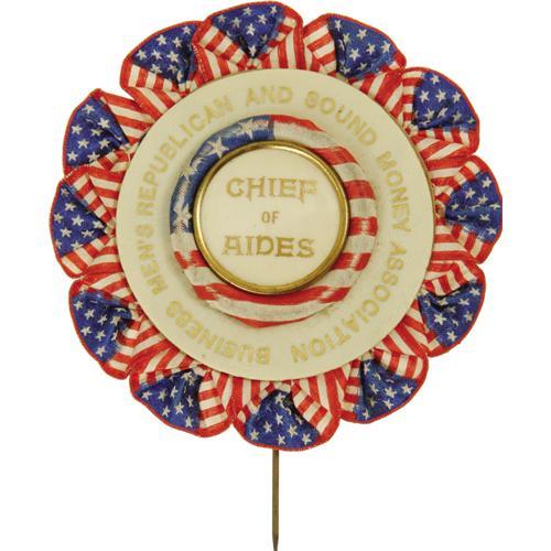 <B>William McKinley: A Most Unusual Large, Vibrant Celluloid "Sound Money Association" Pin</B></I> from the 1896 or 1900 campaign. A 1¼" center celluloid is surrounded by a raised cloth covered red, white, and blue border. This is set into the center of a 2½" celluloid disc bearing the slogan in gilt lettering "Business Men's Republican and Sound Money Association." The outer border is formed of crimped cloth American flags. We have never seen a badge constructed in this style before. Condition is choice but for a little wear on the raised cloth border around "Chief of Aides". Original straight pin on reverse. Great color and display appeal. Diameter 3 5/8".<BR><BR><b>Shipping:</b> Small Flat (<a target="_blank" href="http://www.heritageauctions.com/common/shipping.php">view shipping information</a>)
