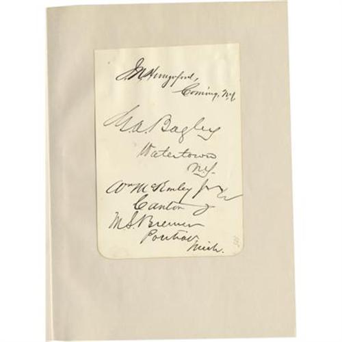<B>William McKinley and Miscellaneous Congressmen's Signatures.</B></I> This lot consists of a 4.75” x 7” leaf of notepaper on which William McKinley and three fellow members of Congress - J. N. Hungerford, G.A. Bagley and M.S. Brewer have boldly signed their names. The leaf has been tipped into a paper folder and all signatures are in fine condition though McKinley's has just a small area of smearing on the “<I>Jr</B></I>”. Comes with an 8.5” x 5.5” image of McKinley and his vice-president, Theodore Roosevelt likely clipped from a book. <BR><BR><b>Shipping:</b> Flat Material, Small (<a target="_blank" href="http://www.heritageauctions.com/common/shipping.php">view shipping information</a>)