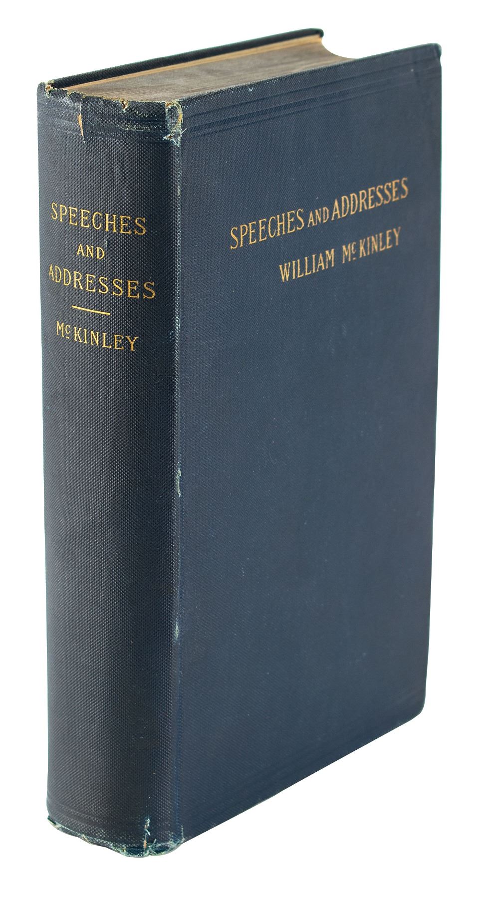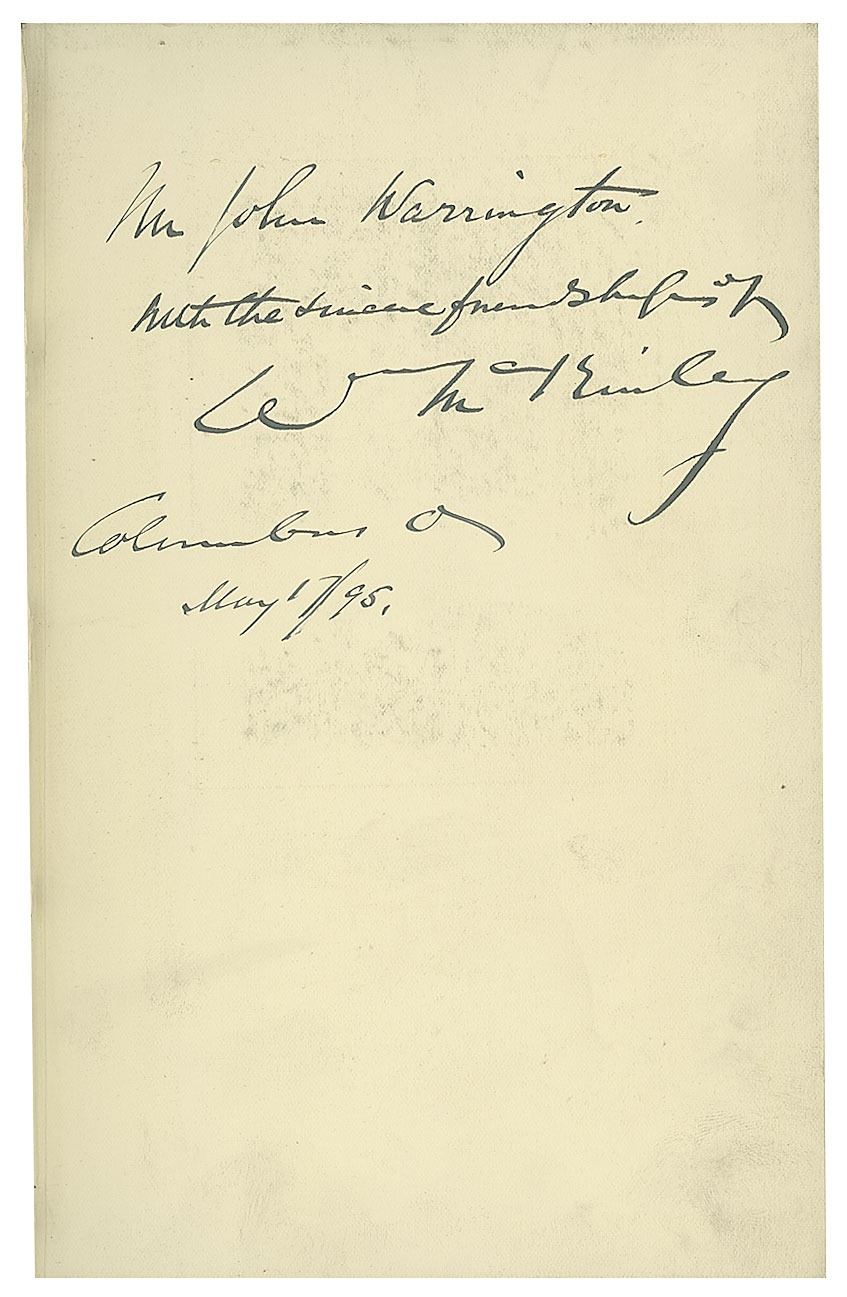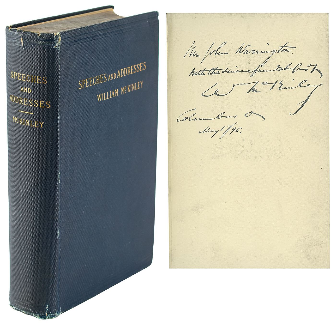 Signed book: Speeches and Addresses of William McKinley. First edition. NY: S. Appleton & Co., 1893. Hardcover bound in navy blue cloth with gilt lettering, 6.5 x 9.25, 664 pages. Boldly signed and inscribed on the first free end page in ink, "Mr. John Warrington, With the sincere friendship of Wm. McKinley, Columbus, O., May 17/95." Autographic condition: fine, with light overall soiling to the signed page. Book condition: VG/None, with edgewear, a small tear at spine head, a "Frederick W. Skiff" bookplate affixed to front pastedown, and a "Library of Lawrence E. Miller" blindstamp to a rear page. A significant pre-presidential volume containing McKinley's speeches and addresses from his time in Congress and as governor of Ohio.