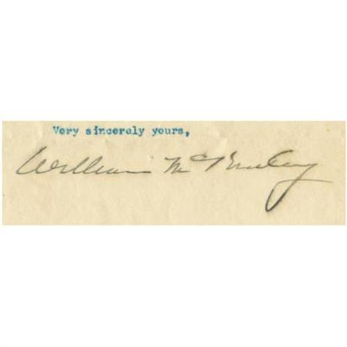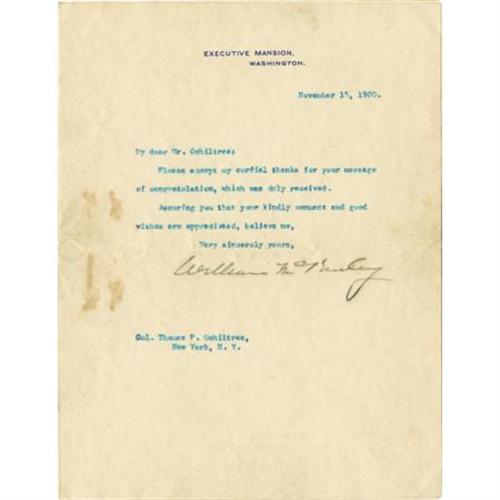 <B>William McKinley Typed Letter Signed,</B></I> 7" x 9", on Executive Mansion stationary, November 15, 1900, Washington. Some bleeding and staining due to water, else very good. <BR><BR><b>Shipping:</b> Flatware (<a target="_blank" href="http://www.heritageauctions.com/common/shipping.php">view shipping information</a>)
