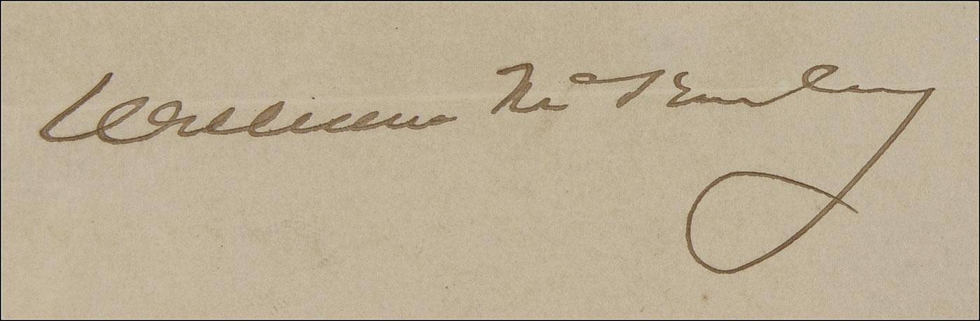 Partly-printed DS as president, signed “William McKinley,” one page, 8 x 10.5, October 12, 1897. The president states to Emil Rose of New York City, “You are hereby removed from the Office of Assistant Appraiser of Merchandise in the District of New York in the State of New York to take effect upon the appointment and qualification of your successor.” Double-matted with a portrait to an overall size of 22.5 x 18.25. In fine condition, with even shade of toning and a horizontal fold passing through his name. An uncommon Executive Mansion order.