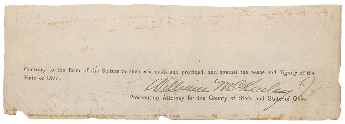 Ink signature, “William McKinley, Jr.,” on an off-white 8.5 x 3 slip clipped from a larger document, with McKinley signing as the prosecuting attorney for the County of Stark and the State of Ohio. In very good condition, with scattered creases and wrinkles, some lightly affecting signature, several edge chips and tears, scattered adhesive remnants, and a central vertical fold.