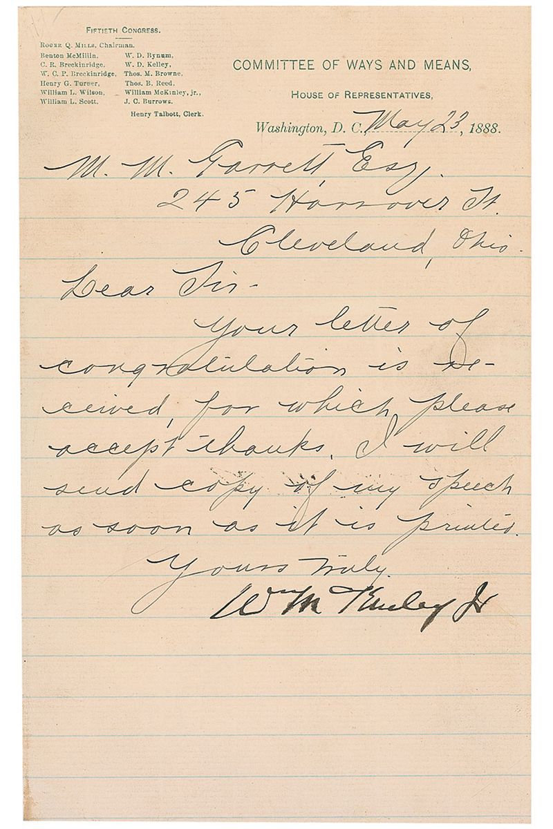 LS signed “Wm. McKinley, Jr.,” one page, lightly-lined, 5 x 8, Committee of Ways and Means letterhead, May 23, 1888. Letter to M. M. Garrett, Esq. In part: “Your letter of congratulations is received…I will send copy of my speech as soon as it is printed.” Mild scattered toning and soiling, a light erased pencil notation to the upper left, and slight mirroring to signature’s ink, otherwise fine condition.