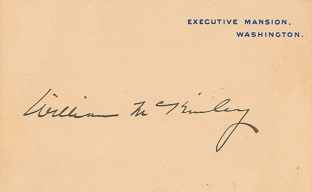 Very desirable Executive Mansion card, boldly signed in black ink, “William McKinley.” A few insignificant marks and nicks to the surface, and mild mounting remnants to reverse, otherwise fine condition. Accompanied by the original letter of transmittal from his secretary on Executive Mansion letterhead, dated December 22, 1900, as well as the Executive Mansion mailing envelope. This was sent just eight months prior to McKinley’s assassination at the hand of anarchist Leon Czolgosz; when Roosevelt succeeded him in office, he had the remaining Executive Mansion stationery printed with black borders in McKinley’s memory, and after a month-long morning period had new cards and stationery printed with the words ‘White House,’ replacing ‘Executive Mansion.’