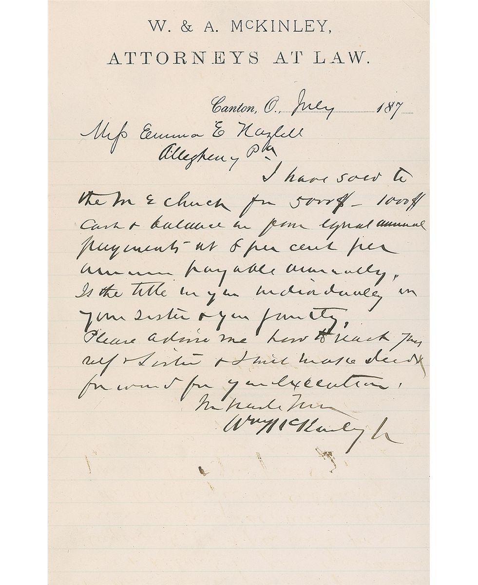 ALS signed “Wm. McKinley, Jr.,” one page, lightly-lined, 5.5 x 8.5, W. & A. McKinley, Attorneys at Law letterhead, Canton, Ohio, circa 1870s. Letter to friend and client Emma Hazlett regarding a property transaction. In part: “I have sold to the M. E. Church for 5000$—1000$ cash & balance in four equal annual payments at 8 per cent per annum payable annually.” In fine condition, with some insignificant mirroring to ink. Accompanied by the original mailing envelope, postmarked July 27, no year. McKinley ALSs are rather scarce, and this is just the second we have offered on his law firm’s letterhead.