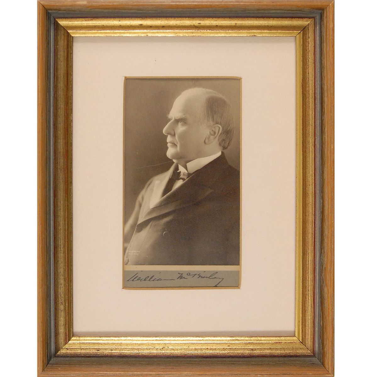 Distinguished matte-finish 3 x 5 photo of McKinley in a profile pose, affixed to a slightly larger mount, signed on the mount in black ink. Matted and framed to an overall size of 7.5 x 9.5. In fine condition.
