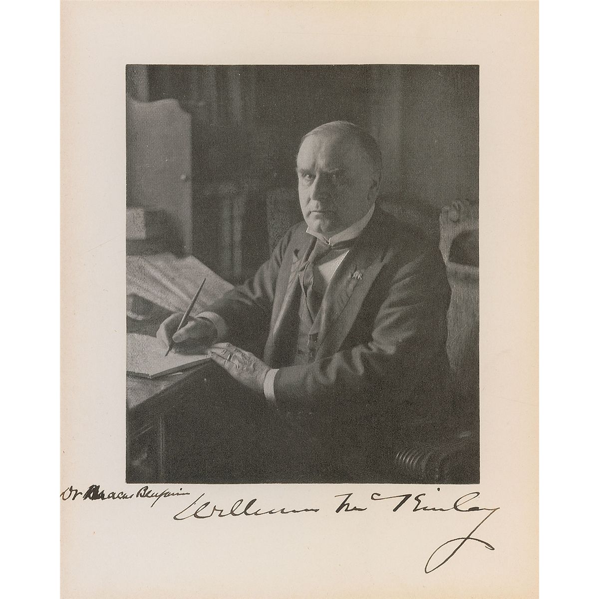 Uncommon 4.25 x 5 paperstock photo of McKinley sitting at his desk, affixed to a 5.75 x 7.25 mount, boldly signed and inscribed on the mount in black ink, “Dr. Marcus Benjamin, William McKinley.” In fine condition, with slightly trimmed edges. Benjamin was a prominent scientist employed by the US National Museum [Smithsonian], for whom the mineral benjaminite was named.