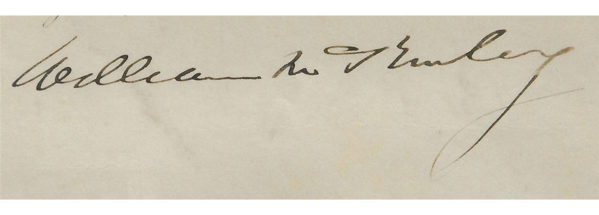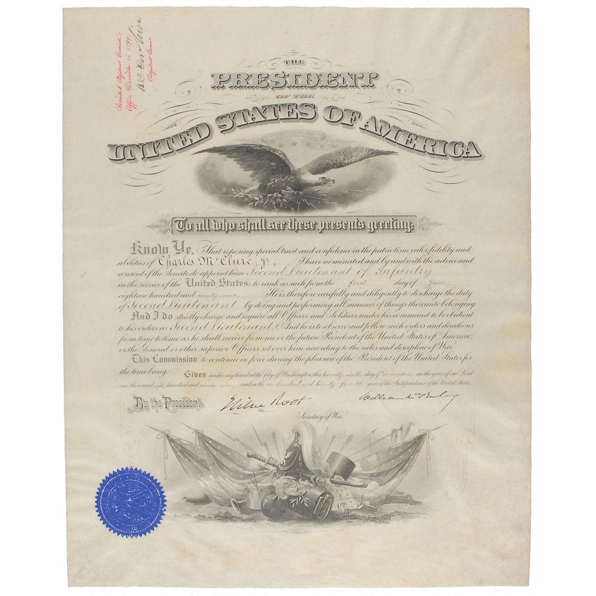 Partly-printed vellum DS as president, one page, 15.75 x 19.5, December 26, 1899. President McKinley appoints Charles McClure, Jr., as “Second Lieutenant of Infantry in the service of the United States.” Boldly signed at the conclusion by President McKinley and Secretary of War Elihu Root. The blue seal affixed to the lower left remains intact with light rubbing. In fine condition. An especially attractive example.