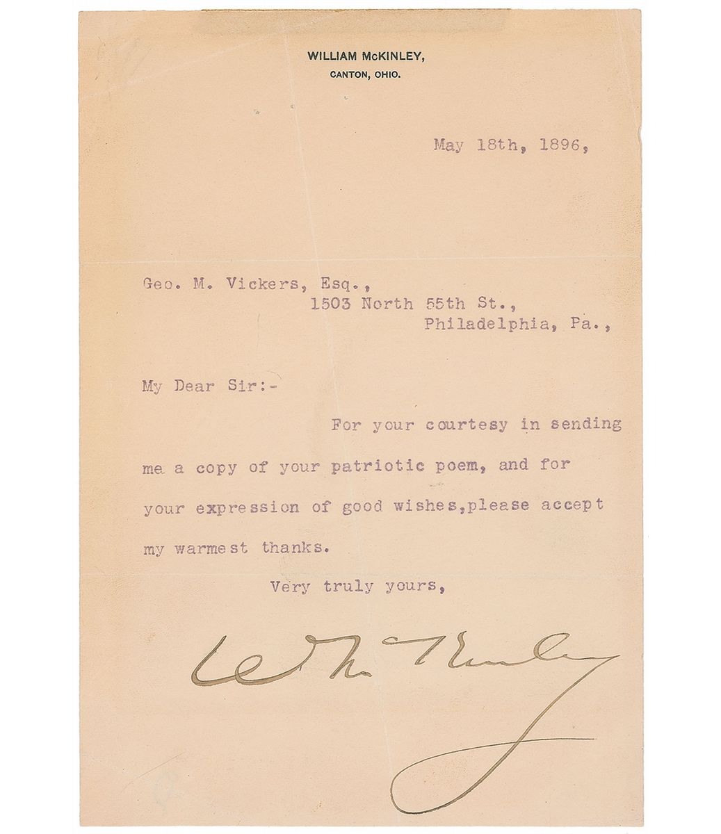 TLS signed “W. McKinley,” one page, 5.25 x 7.75, personal letterhead, May 18, 1896. Letter to George M. Vickers of Philadelphia. In full: “For your courtesy in sending me a copy of your patriotic poem, and for your expression of good wishes, please accept my warmest thanks.” Irregular intersecting folds (one vertical fold passing between letters in the signature), toning to edges, and a few tack holes near the top, otherwise fine condition. Accompanied by an engraved portrait of the president.