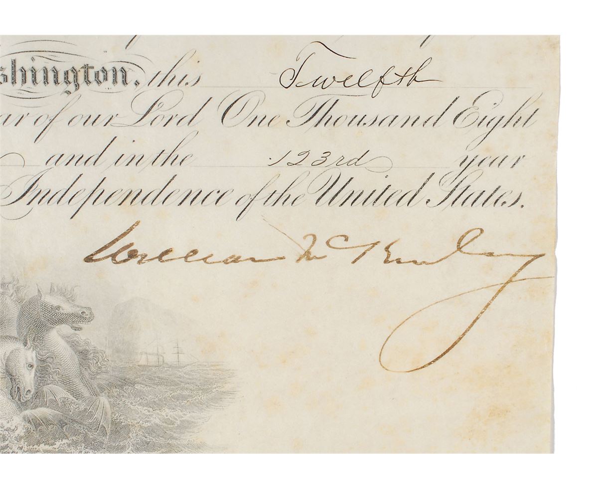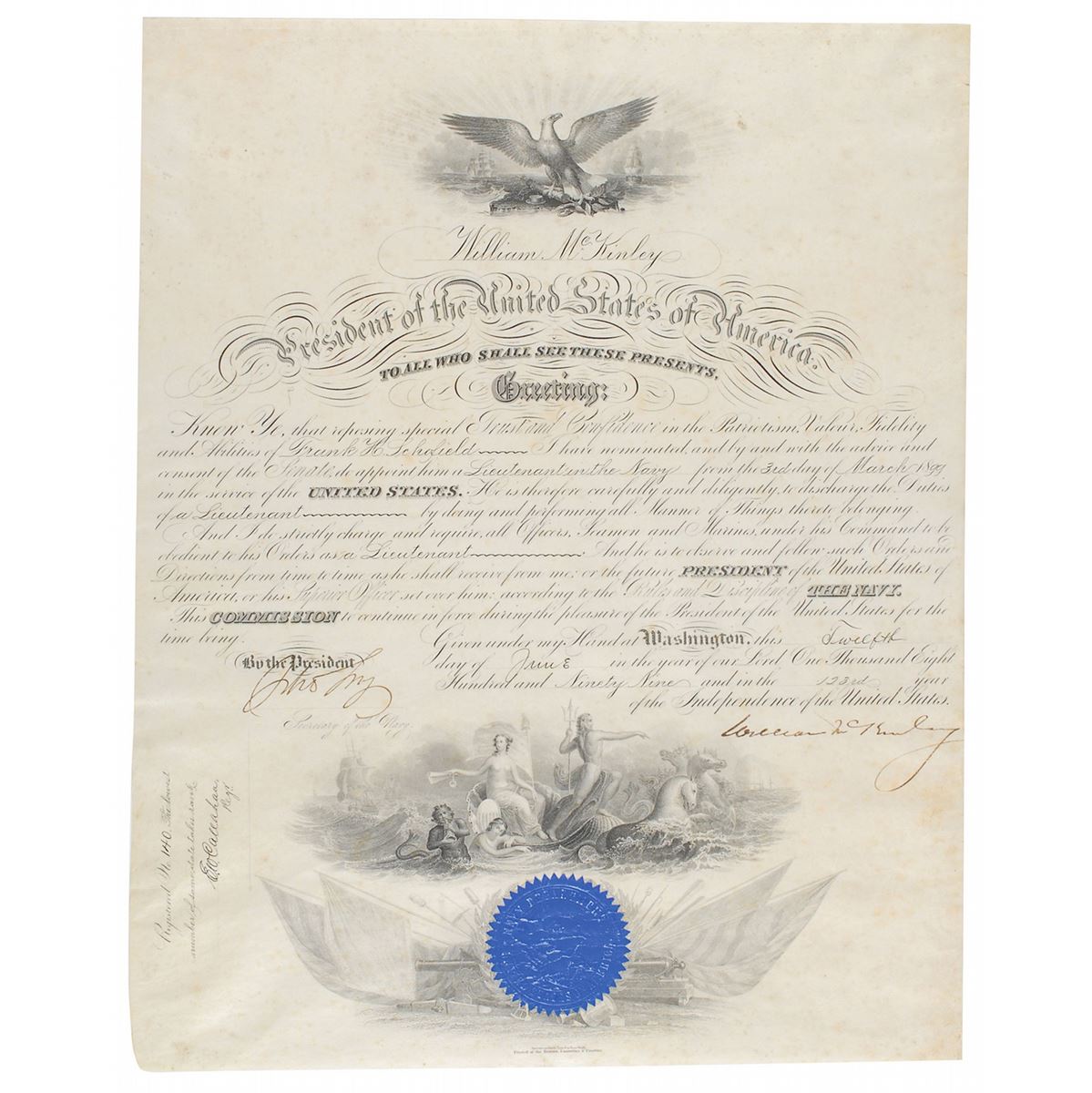 Partly-printed vellum DS as president, one page, 14 x 17.75, June 12, 1899. President McKinley appoints Frank H. Schofield as “a Lieutenant in the Navy.” Signed at the conclusion by President McKinley and countersigned by Secretary of the Navy John D. Long. The blue seal affixed at the bottom remains fully intact. Moderate foxing and soiling, otherwise fine condition.