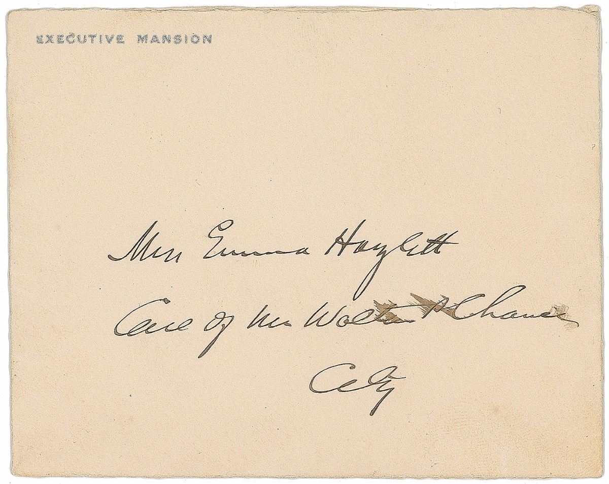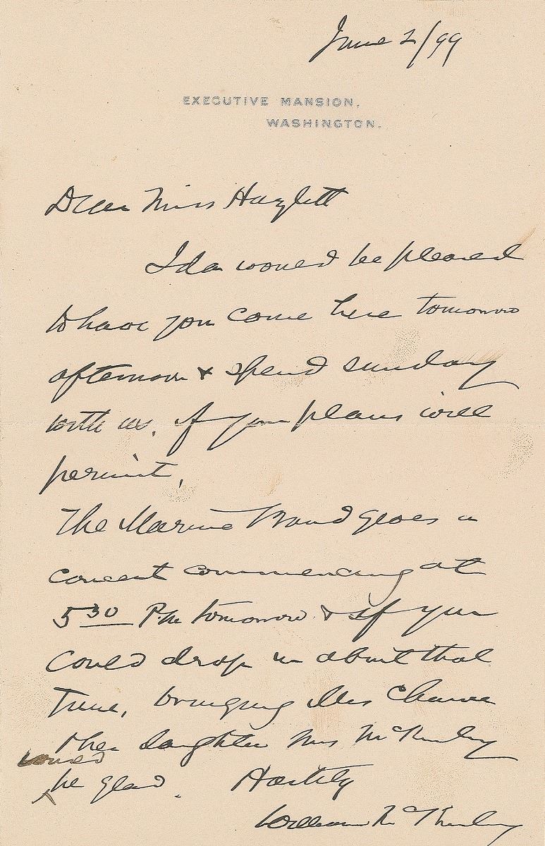 ALS as president, one page, 4.5 x 7, Executive Mansion letterhead, June 2, 1899. Letter to his friend and legal client Emma Hazlett. In part: “Ida would be pleased to have you come here tomorrow afternoon and spend Sunday with us if your plans will permit. The Marine Band gives a concert commencing at 5:30 P.M. tomorrow & if you could drop in about that time, bringing Mrs. Chance & her daughter Mrs. McKinley would be glad.” In fine condition. Accompanied by the original transmittal envelope addressed in McKinley’s hand. A hundred years after its establishment in 1798, the United States Marine Band underwent its most comprehensive reorganization in 1899. In March, President McKinley signed an act that nearly doubled its size and increased the musicians’ pay, thereby attracting some of the nation’s greatest talent. McKinley’s handwritten letters are scarce in general and particularly so as president.
