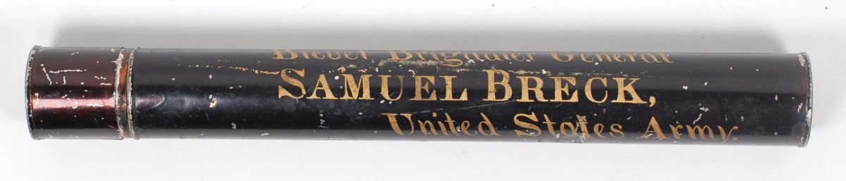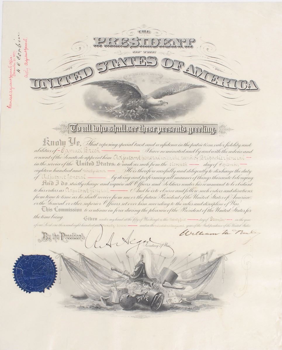 Partly-printed vellum DS as president, one page, 15.5 x 19, December 21, 1897. President McKinley appoints Samuel Breck as “Adjutant General with the rank of Brigadier General in the service of the United States.” Boldly signed at the conclusion by McKinley and countersigned by Secretary of War Russell A. Alger. The dark blue seal affixed to the lower left remains mostly intact. Also includes a series of other documents related to Breck, including his 1855 diploma from West Point. Rolled and in fine condition. Accompanied by a contemporary metal tube hand-painted with Breck’s name and rank. During the Civil War, Breck was engaged in the occupation of Fredericksburg and the Shenandoah Valley expedition. An exceptionally well preserved document enhanced by its many accompaniments.