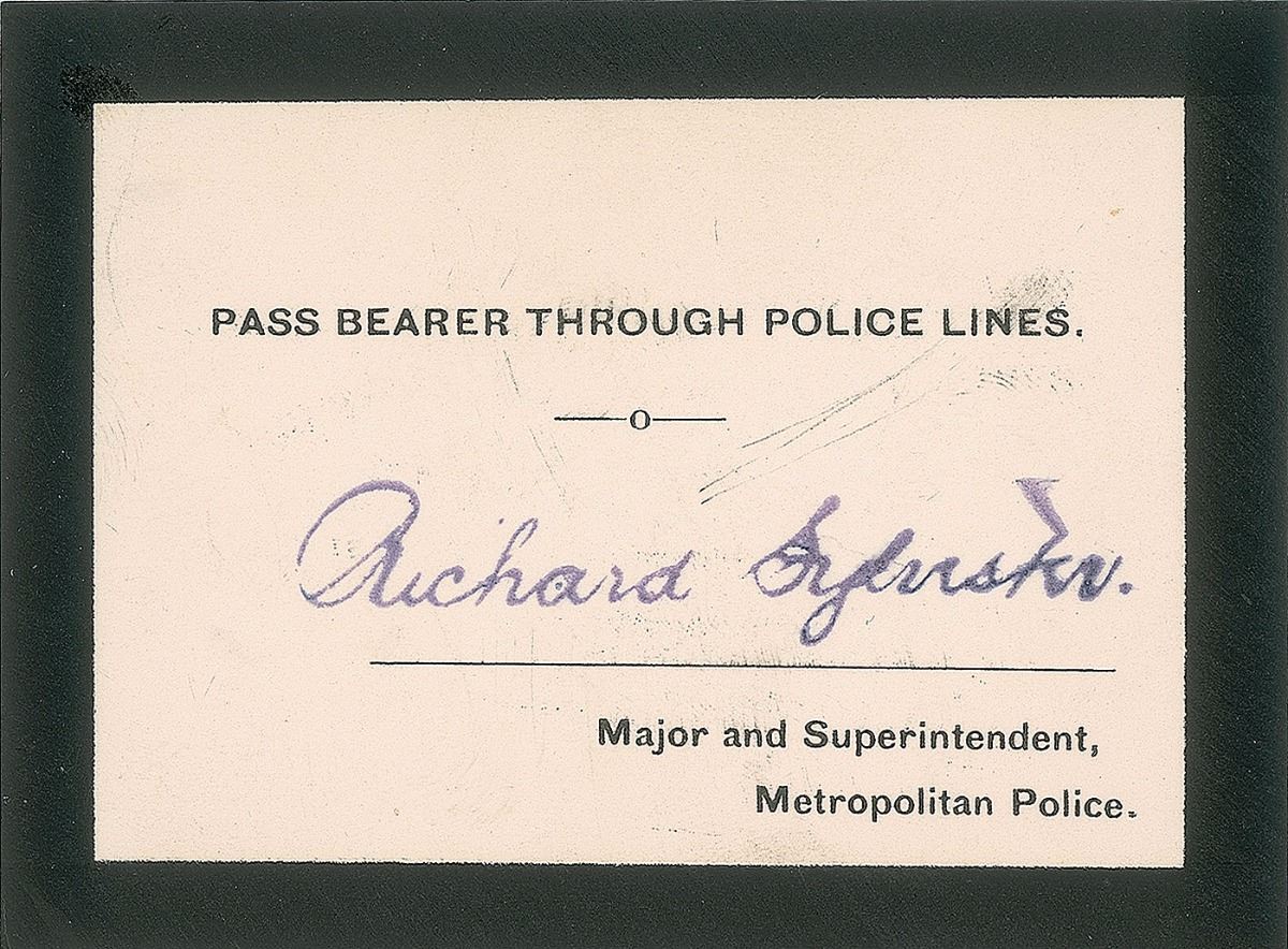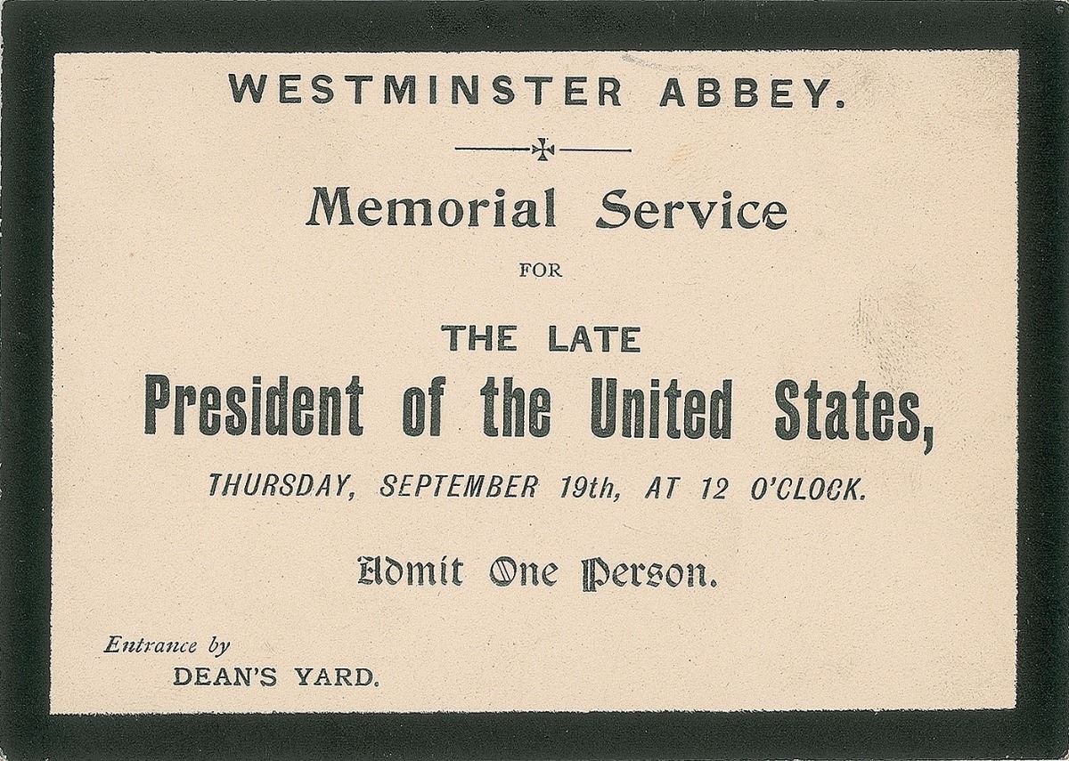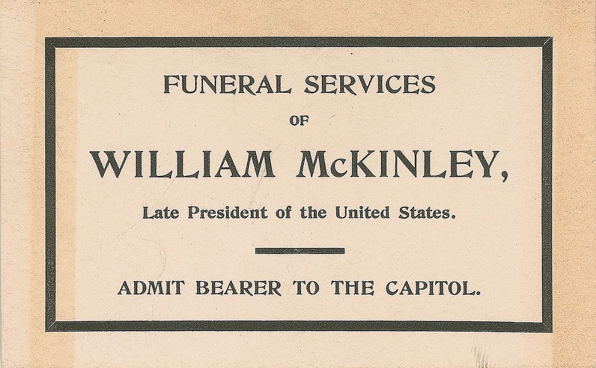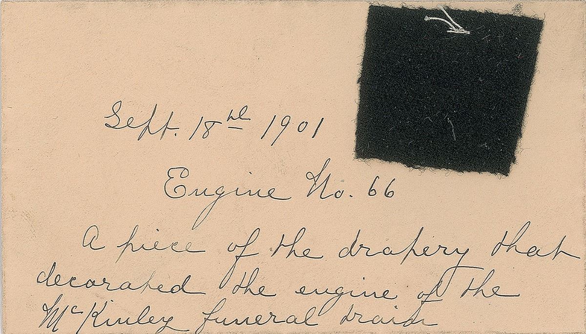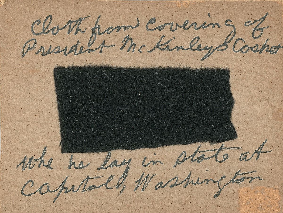 Five items related to the unexpected death of the president, including: a swatch of black cloth affixed to a 5 x 4 card bearing a handwritten notation, “Cloth from covering of President McKinley’s casket”; a smaller swatch of black fabric sewn to a small envelope bearing a handwritten notation, “Sept. 18th, 1901, Engine No. 66, a piece of the drapery that decorated the engine of the McKinley funeral train”; and three different types of admission passes to various services.