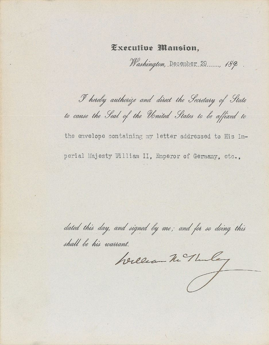 Choice partly-printed DS as president, one page, 7.75 x 10, December 29, 1898. President McKinley authorizes and directs the “Secretary of State to cause the Seal of the United States to be affixed to the envelope containing my letter addressed to His Imperial Majesty William II, Emperor of Germany.” Crisply signed at the conclusion by McKinley. In fine condition. Interestingly, Germany was an American enemy at this time—Kaiser Wilhelm had even drawn up plans for an invasion of the United States in an effort to reduce the nation’s influence in the world. However, the chief foreign relations conflict for President McKinley had been the Spanish-American War which came to a conclusion earlier in the month of December. A beautiful example of this scarce document format.