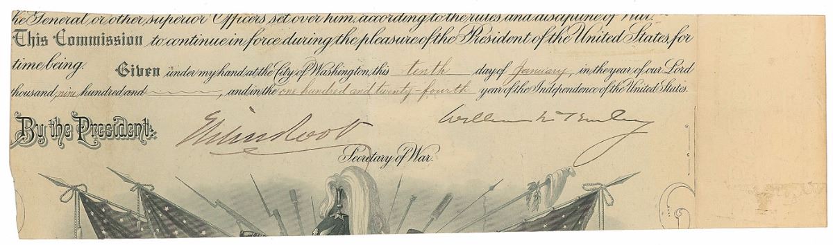 Partial partly-printed DS as president, one page, 13.5 x 3.75, January 10, 1900. Concluding portion of a military appointment, signed in ink by President McKinley and countersigned by Secretary of War Elihu Root. In fine condition, with trimmed edges.