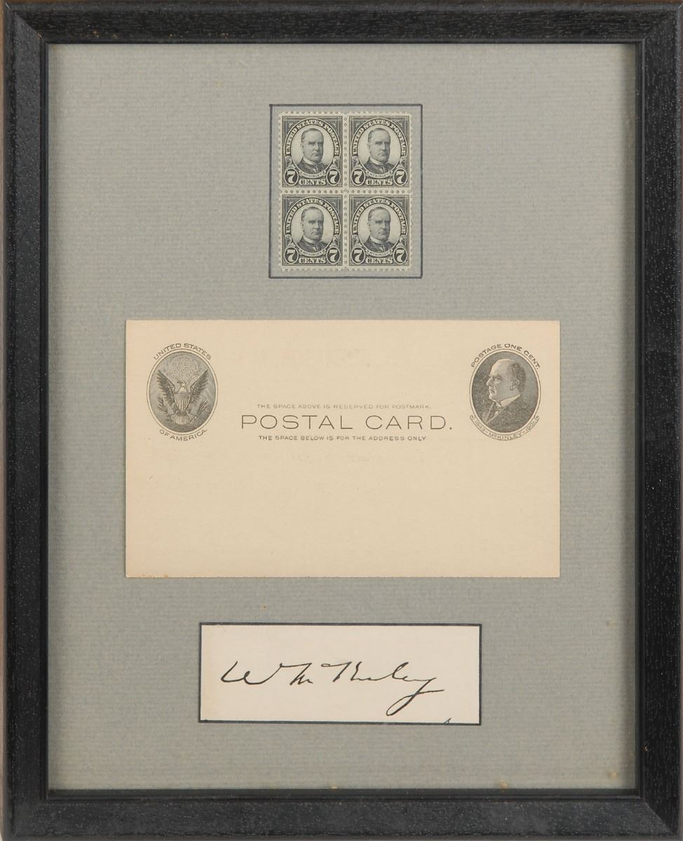 Bold ink signature, “W. McKinley,” on an off-white 3.5 x 1.25 card. Matted and framed with a postal card and a block of 7-cent stamps to an overall size of 8.5 x 10.5. In fine condition.