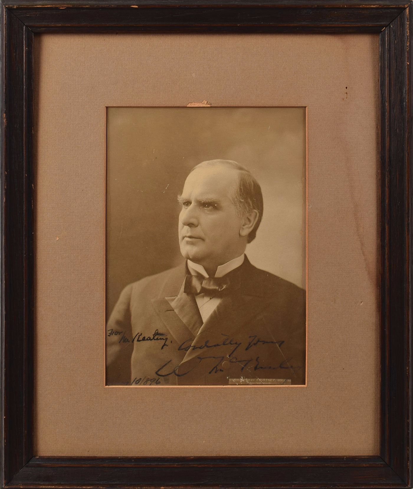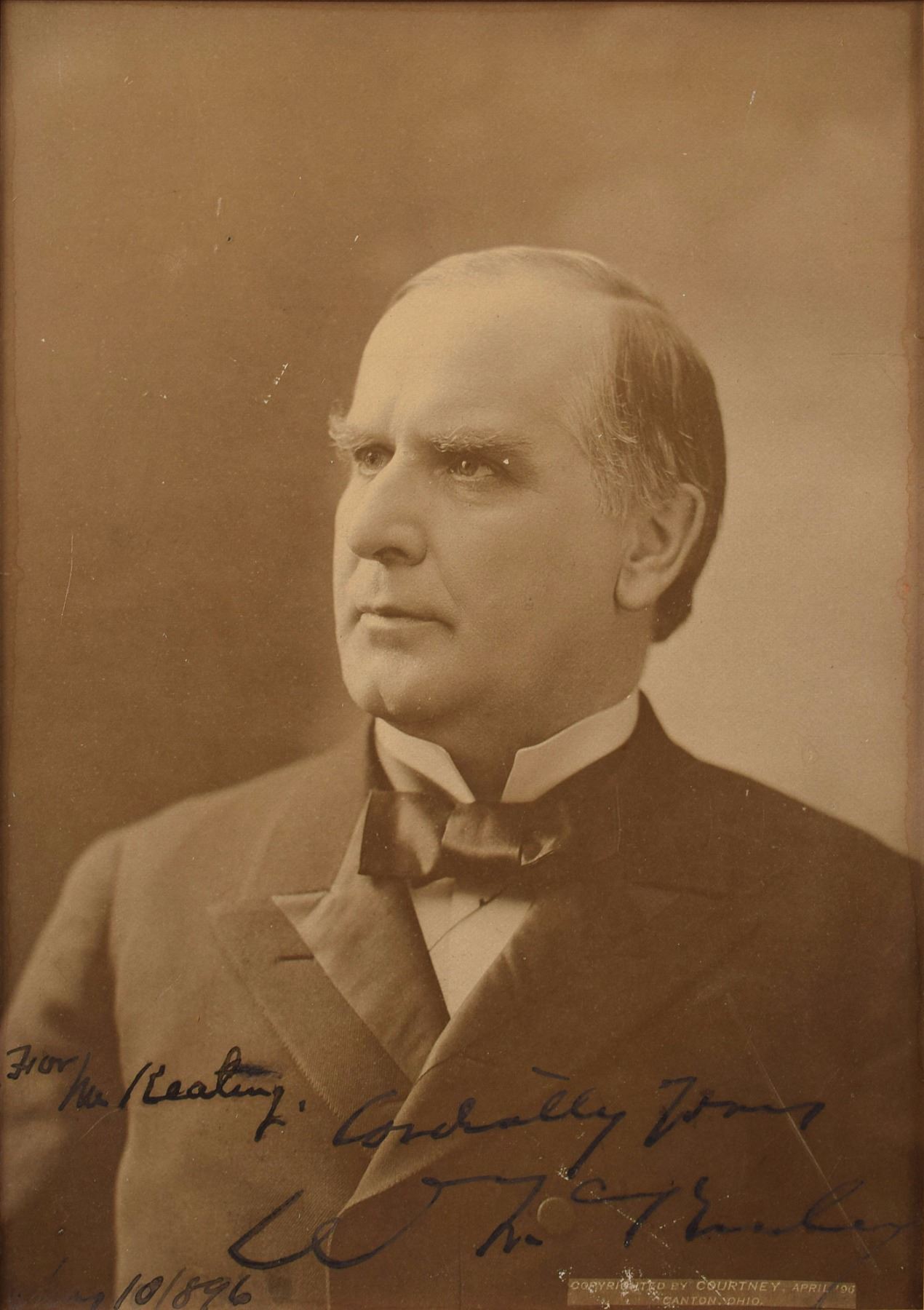 Desirable matte-finish 5.5 x 7.75 portrait of McKinley in a head-and-shoulders pose by the Courtney Studio of Canton, Ohio, signed and inscribed in fountain pen, "For Mr. Keating, Cordially yours, W. McKinley, May 10/896.” Matted and framed to an overall size of 11.25 x 13.5, with glass missing to frame. In very good to fine condition, with chipping and water staining to the mat; the photo itself is in fine condition.