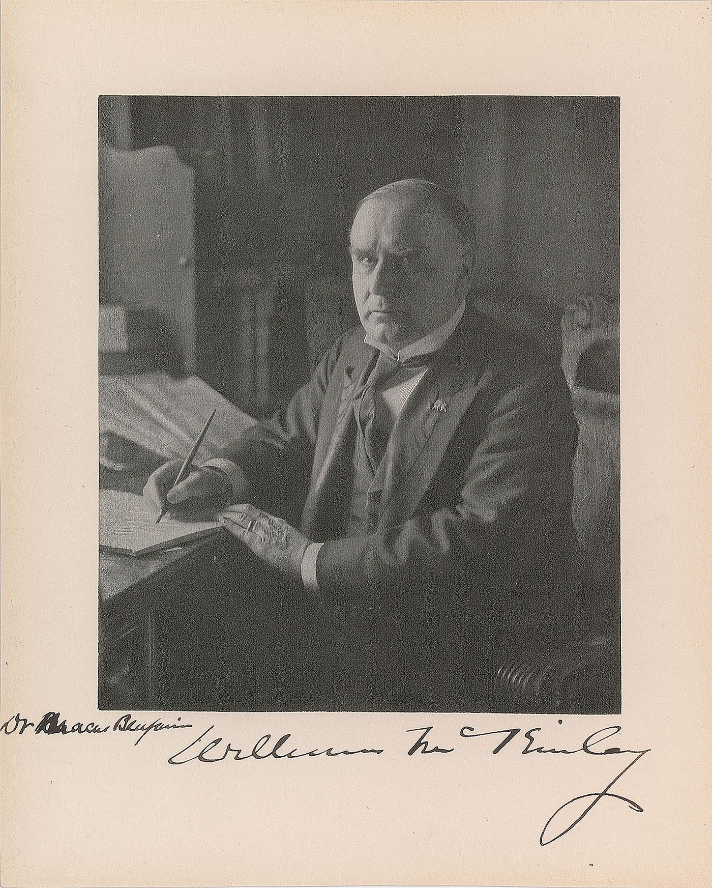 Uncommon 4.25 x 5 bookplate photo of McKinley working at his desk, affixed to the original 5.75 x 7.25 cardstock mount, signed and inscribed on the mount in fountain pen, "Dr. Marcus Benjamin, William McKinley.” In fine condition. Benjamin was a marine taxonomist and the longtime editor of publications for the United States National Museum; the mineral benjaminite was named in his honor.
