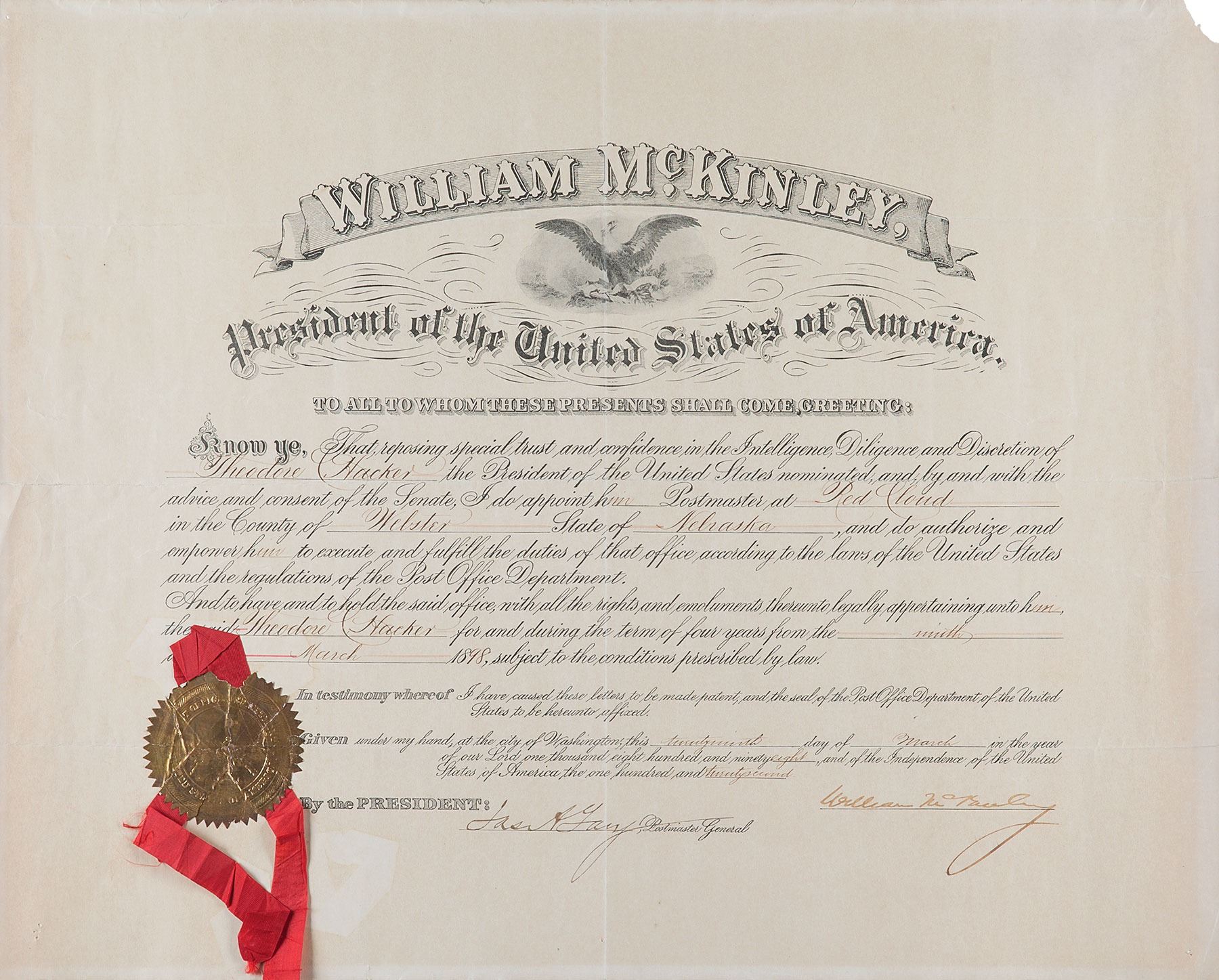 Partly-printed DS as president, one page, 20 x 16, March 29, 1898. President McKinley appoints Theodore Hacker as "Postmaster at Red Cloud in the County of Webster State of Nebraska." Signed at the conclusion by McKinley, and countersigned by Postmaster General James A. Gary. Lower left retains the original gold seal and red ribbon. In very good condition, with toning, creasing, intersecting folds, and a missing upper right corner tip.