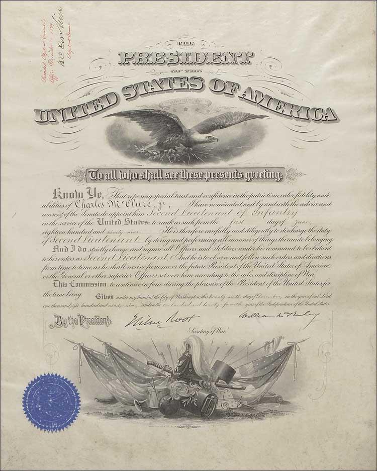 Vellum DS as president, one page, 15.75 x 19.5, December 26, 1899. President McKinley appoints Charles McClure, Jr. a Second Lieutenant in the Infantry. Boldly signed at the conclusion in black ink by McKinley, and countersigned by Secretary of War Elihu Root. In fine condition, with a bit of scattered light toning and wrinkles. The blue seal is slightly worn, but intact. McClure would die of dysentery while serving in the Philippines in 1901 and was laid to rest in Arlington National Cemetery. Pre-certified John Reznikoff/PSA/DNA and RRAuction COA.