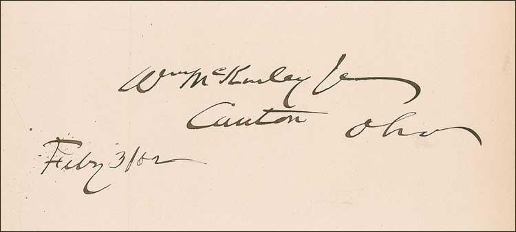 Ink signature, “Wm. McKinley, Jr., Canton, Ohio, Feby. 3/82,” on an off-white 6.5 x 3 trimmed album page. In fine condition, with a thin vertical line of toning through first letter of signature, and a light overall shade of toning. Pre-certified John Reznikoff/PSA/DNA and RRAuction COA.