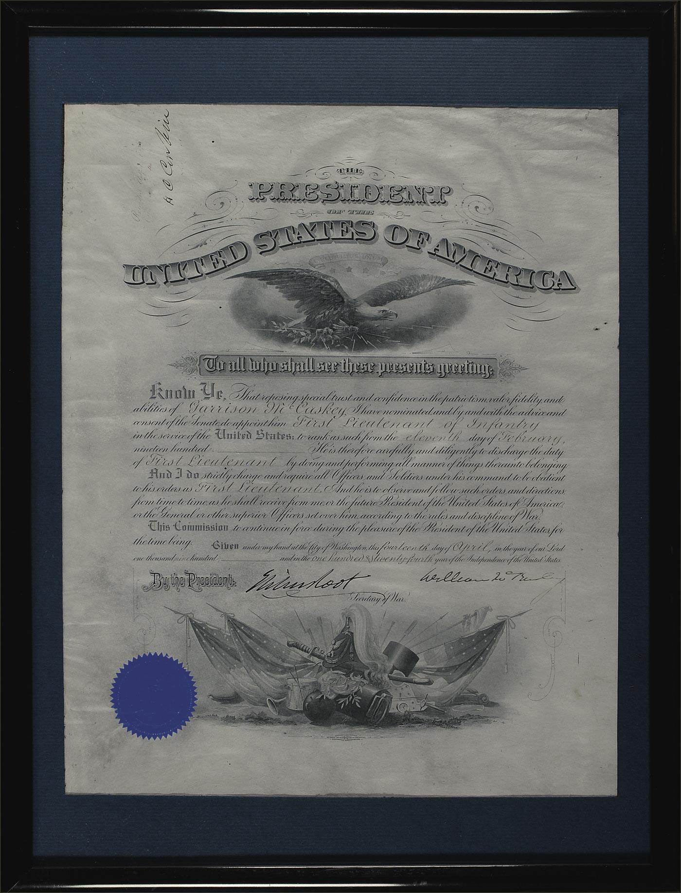 Partly-printed DS as president, one page, 15.5 x 19.25, April 14, 1900. President McKinley appoints Garrison McCaskey “a First Lieutenant of Infantry.” Signed at the conclusion in black ink by McKinley, and countersigned by Secretary of War Elihu Root. Matted and framed to an overall size of 19 x 25. In fine condition, with last few letters of signature a bit light due to decrease in flow, and some light wrinkling. McCaskey served with the 15th Infantry Regiment in the Philippines. Oversized. Pre-certified John Reznikoff/PSA/DNA and RRAuction COA.
