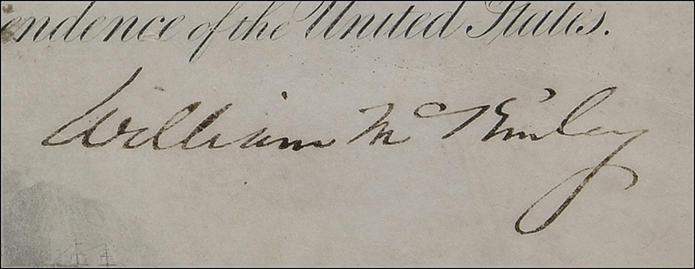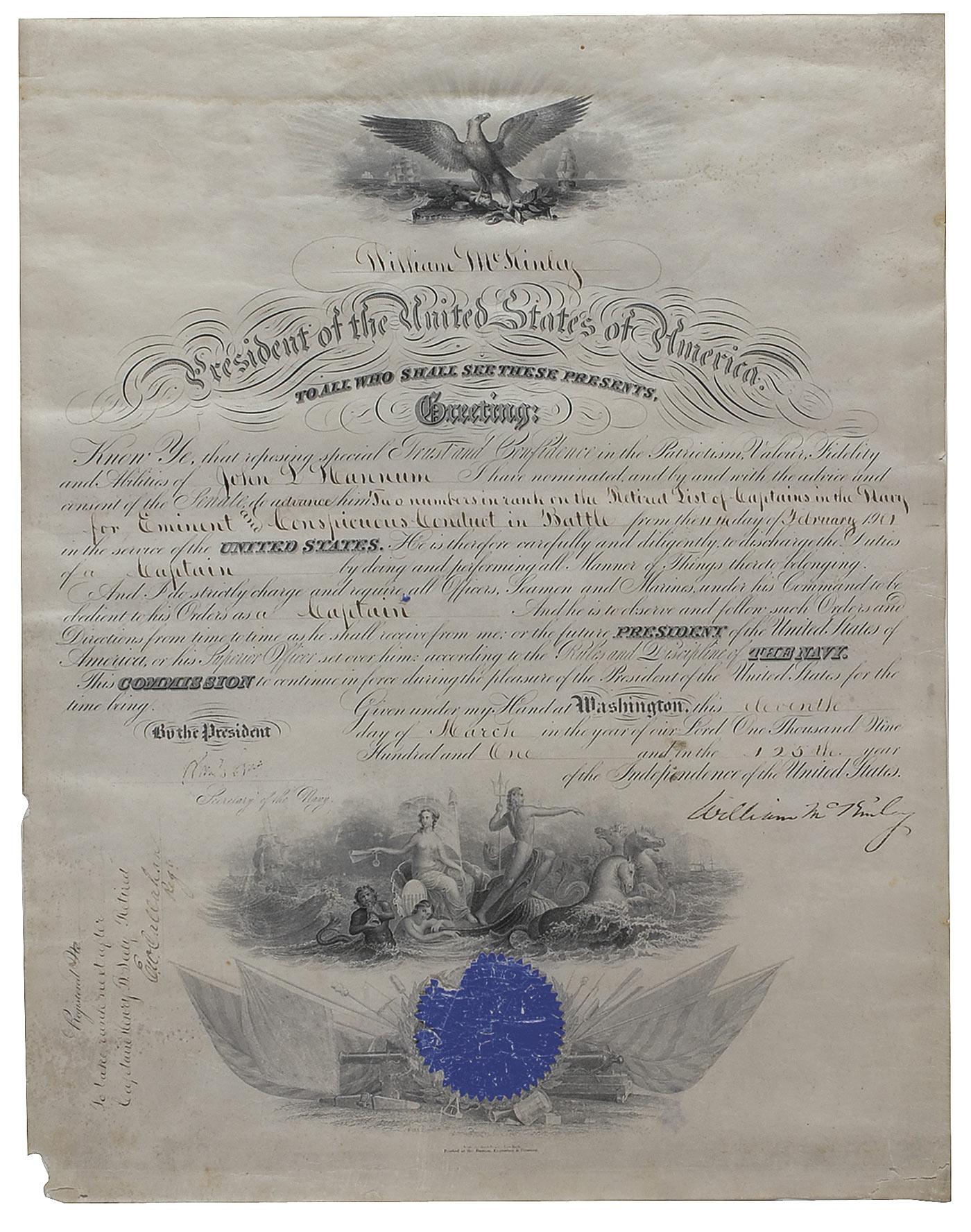 Partly-printed DS as president, one page, 14.5 x 18.5, March 11, 1901. McKinley advances John L. Hannon “two numbers in rank on the Retired List of Captains in the Navy for Eminent and Conspicuous Conduct in Battle.” Signed at the conclusion by McKinley, and countersigned by Secretary of the Navy John Long. In very good condition, with light paper loss to edges and bottom corners, repair to bottom corner, scattered toning and soiling, and Long’s signature light, but mostly legible. The blue seal is mostly intact, but worn. Pre-certified John Reznikoff/PSA/DNA and RRAuction COA.
