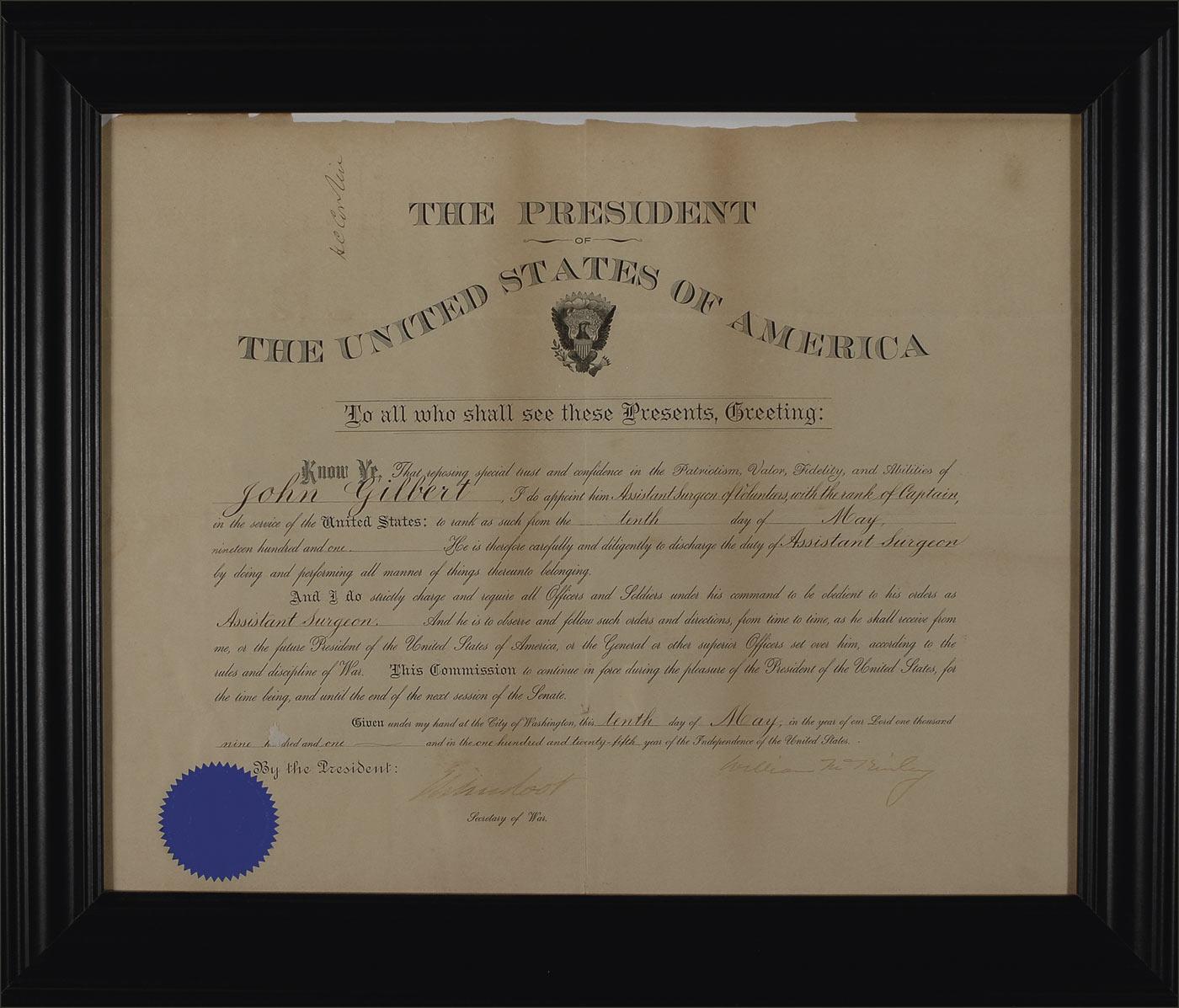 Partly-printed DS as president, one page, 19.5 x 15.5, May 10, 1901. McKinley appoints an assistant surgeon. In part: “Know Ye. That reposing special trust and confidence in the Patriotism, Valor, Fidelity, and Abilities of John Gilbert, I do appoint him Assistant Surgeon of Volunteers, with the rank of Captain.” Also signed by Secretary of State Elihu Root. Matted and framed to an overall size of 23.5 x 19.75. Intersecting folds, uniform toning with two heavier strips lightly affecting the signature and countersignature, scattered paper loss along the top edge, and the signature quite faded but legible, otherwise very good condition. The blue paper seal is intact.