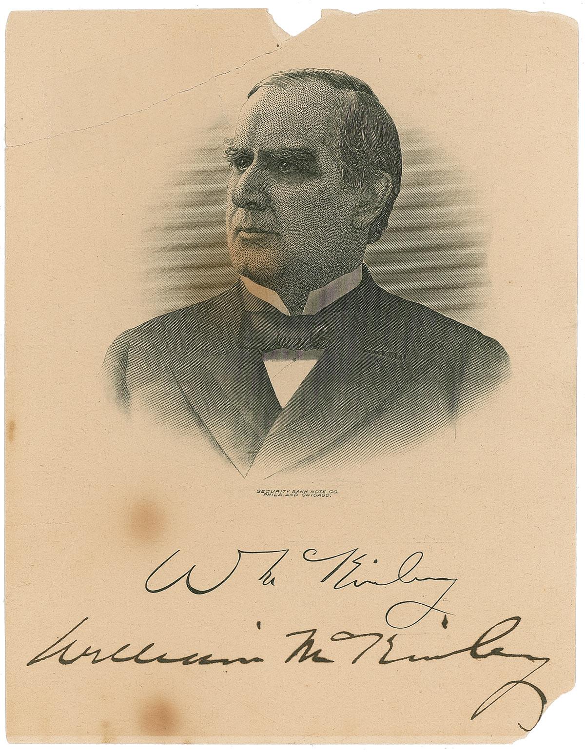 Engraved portrait of McKinley, 4.75 x 6, by the Security Bank Note Company, signed in fountain pen beneath a facsimile signature. Several large spots of foxing, missing paper at bottom right corner and top border, and a repaired torn top left corner archivally repaired on front and back, otherwise very good condition.