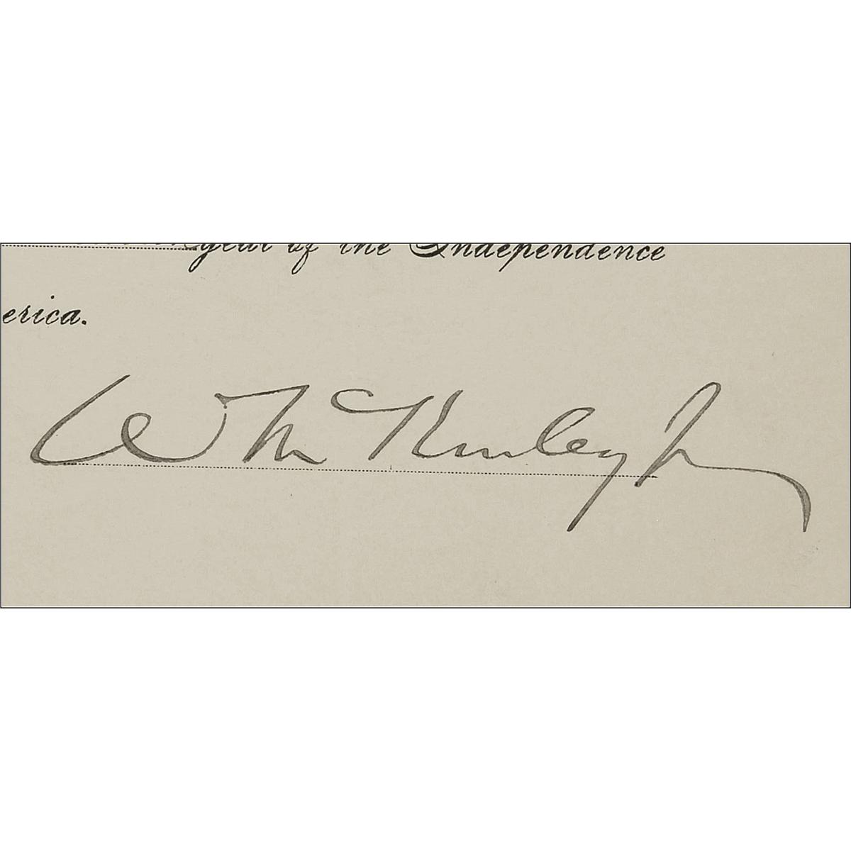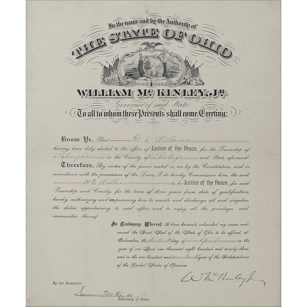 Partly-printed DS, signed “W. McKinley,” one page, 14 x 17, April 13, 1893. McKinley, as governor of Ohio, appoints D. E. Willson “a Justice of the Peace, for the Township of Palmyra, in the County of Portage.” Signed at the conclusion by McKinley, and countersigned by the secretary of state. In fine condition, with intersecting folds, one slightly affecting a single stroke of signature, a few small staple holes along top left edge, and a bit of scattered mild toning and soiling.