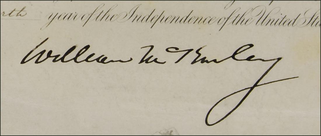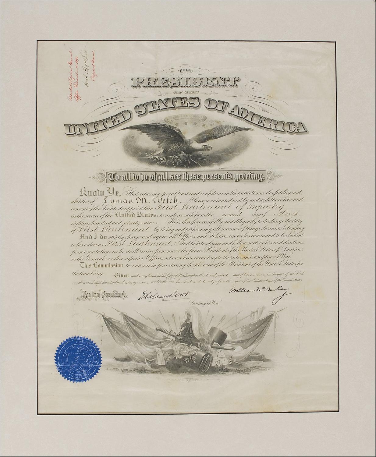 Partly-printed DS as president, one page, 15.5 x 19, December 26, 1899. President McKinley appoints Lyman M. Welch a “First Lieutenant of Infantry.” Boldly signed at the conclusion in black ink by McKinley, and countersigned by Secretary of War Elihu Root. Matted to an overall size of 20 x 24. In very good to fine condition, with intersecting folds, scattered light creasing and wrinkling, as well as scattered mild toning. The blue seal is creased and worn, but intact.
