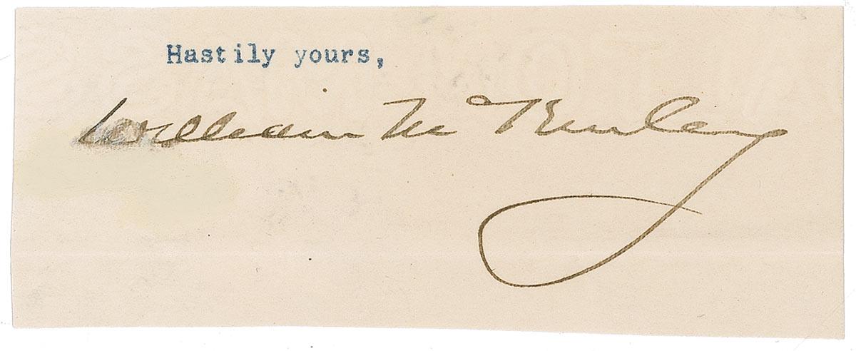 Ink signature, “William McKinley,” on an off-white 4.25 x 1.75 slip clipped from the closing of a letter. In very good condition, with brush to beginning of signature, horizontal fold to bottom of slip, and a bit of light toning.