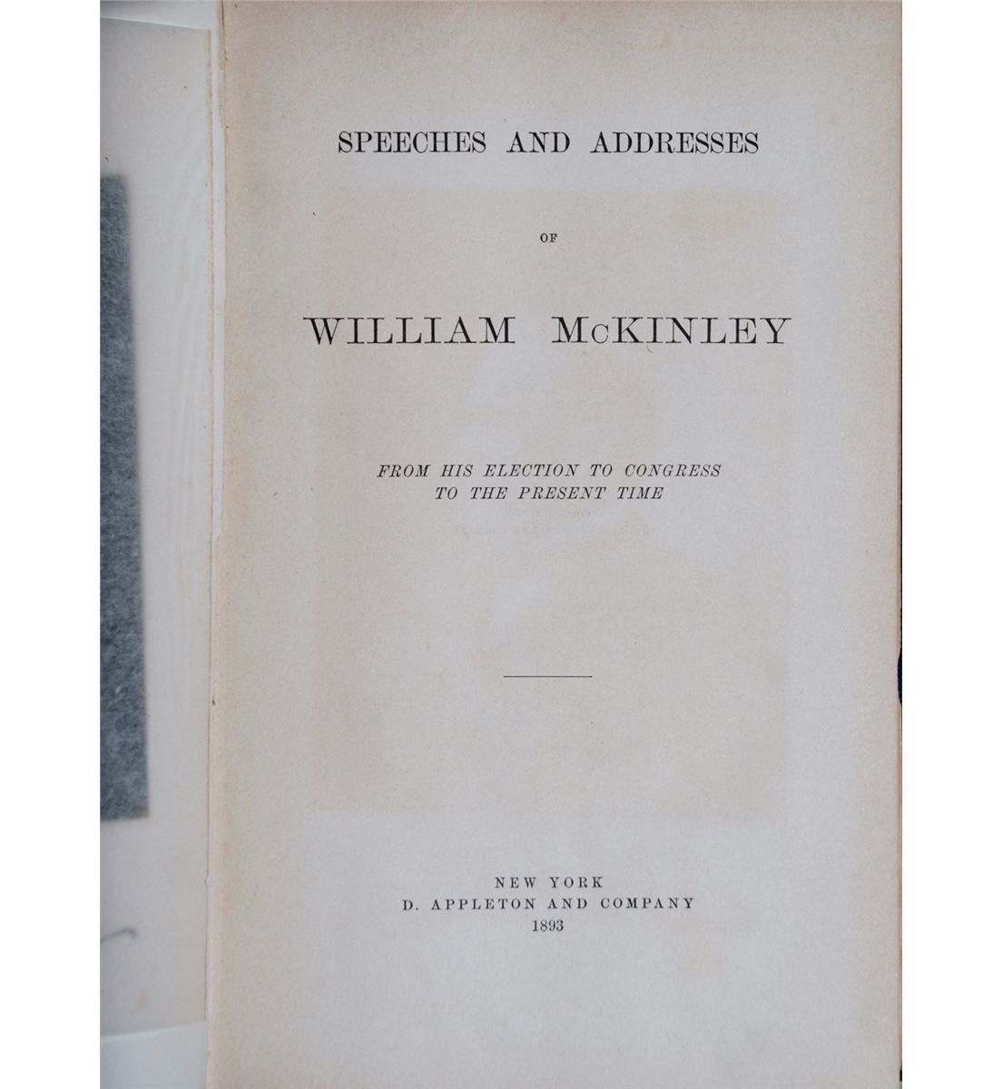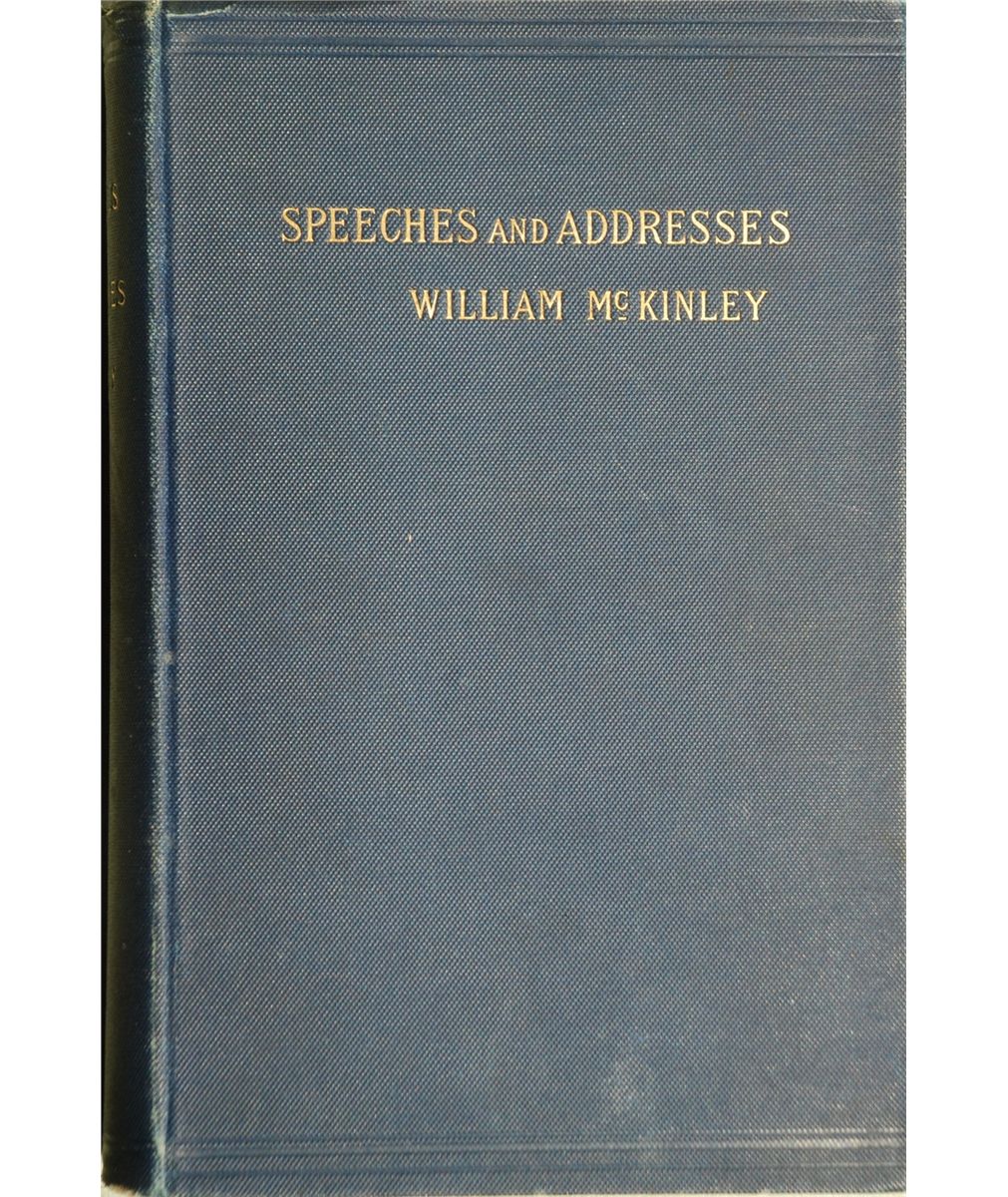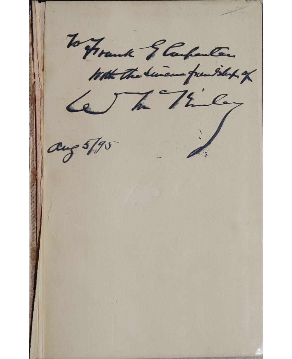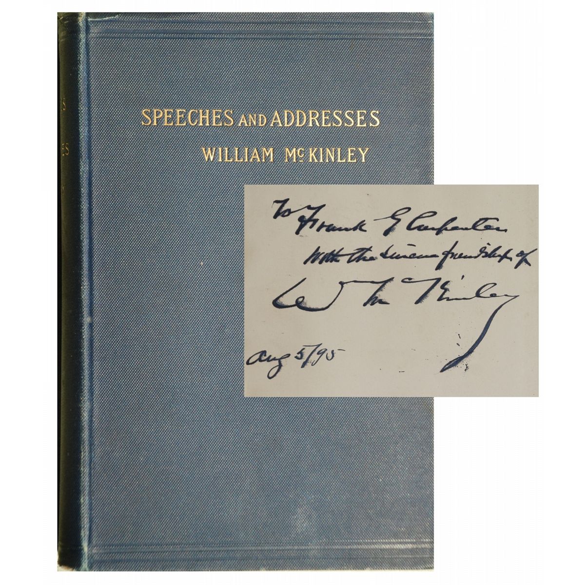 25th President of the U.S. Signed book: Speeches and Addresses of William McKinley. NY: D. Appleton and Company, 1894. Hardcover, 6.25 x 9.5, 664 pages. Signed on the first free end page, “To Frank G. Carpenter with the sincere friendship of Wm McKinley Aug 5/95.” very good condition. Carpenter was an author, photographer, lecturer, collector of photographs. Carpenter was a writer of standard geography textbooks and lecturer on geography, and wrote a series of books called Carpenter's World Travels which were very popular between 1915 and 1930.He donated his photo collection to the Library of Congress.