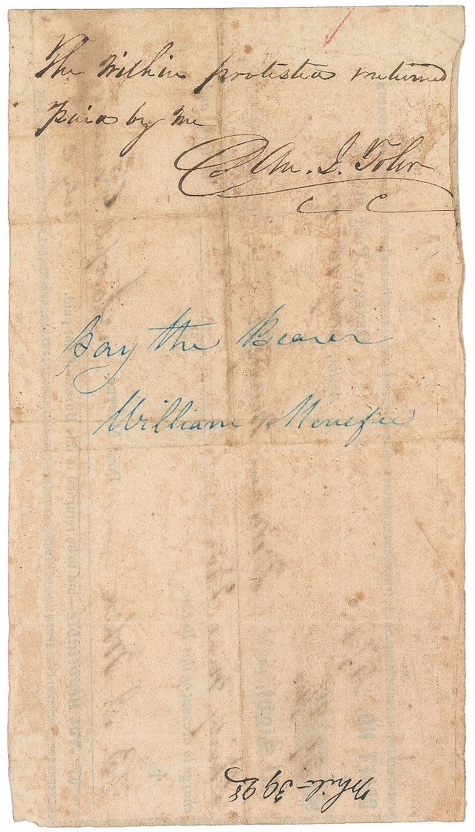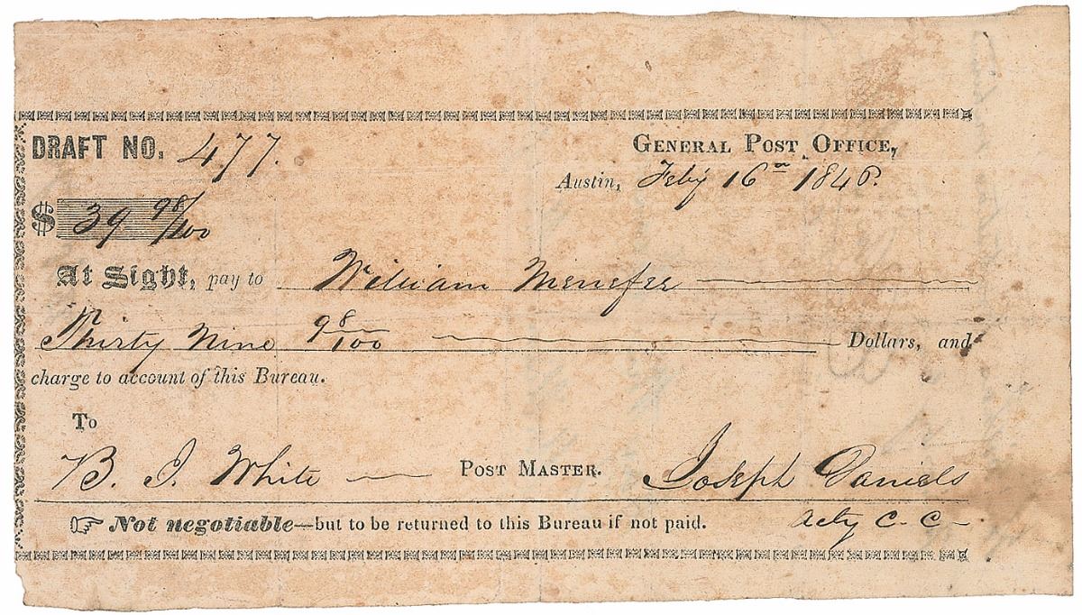 Lawyer and public official (1796–1875) who signed the Texas Declaration of Independence. Partly-printed DS, endorsed on the reverse, “Pay the Bearer, William Menefee,” one page, 7 x 3.75, February 16, 1846. Postal draft, in part: “At Sight, pay to William Menefee Thirty Nine 98/100 Dollars.” In very good condition, with intersecting folds and moderate overall foxing and staining. Provenance: The Robert Davis Collection.