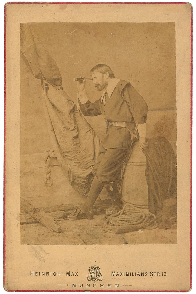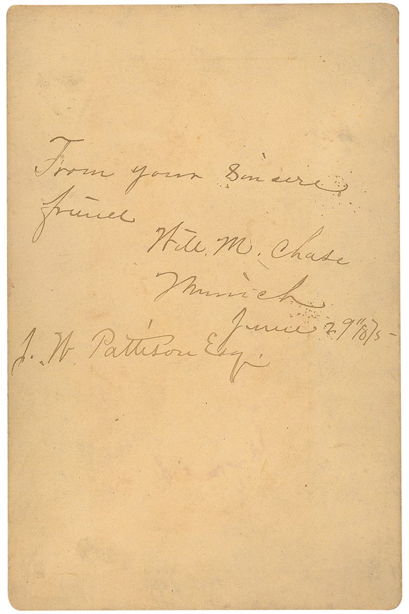 Distinguished American painter (1849–1916) best known for his society portraits rendered in his distinctive impressionist style. Uncommon original 4.25 x 6.5 cabinet photo of Chase looking through a spyglass by Heinrich Max of Munich, signed and inscribed on the reverse in black ink “From your sincere friend Will. M. Chase, Munich, June 29 1875, J. W. Pattison Esq.” In very good condition, with scattered light toning and soiling to reverse, and scattered light soiling and spotting to image side, as well as some scattered light silvering.