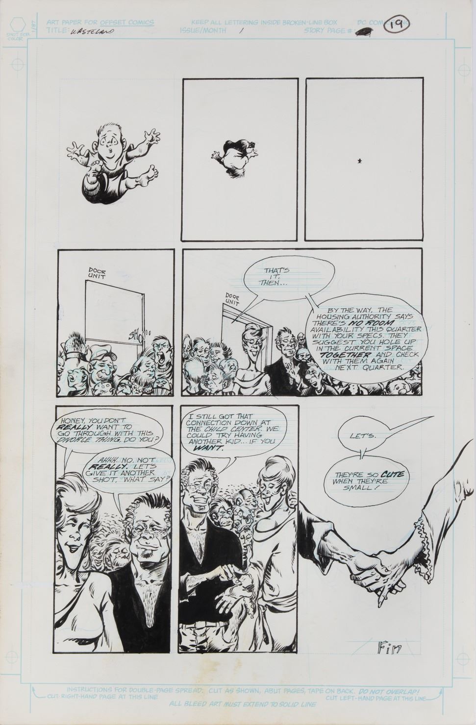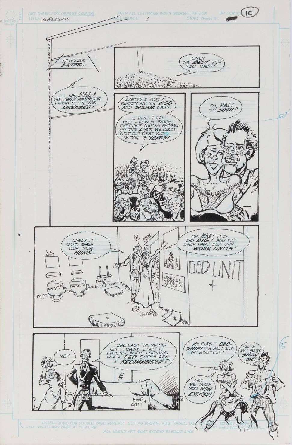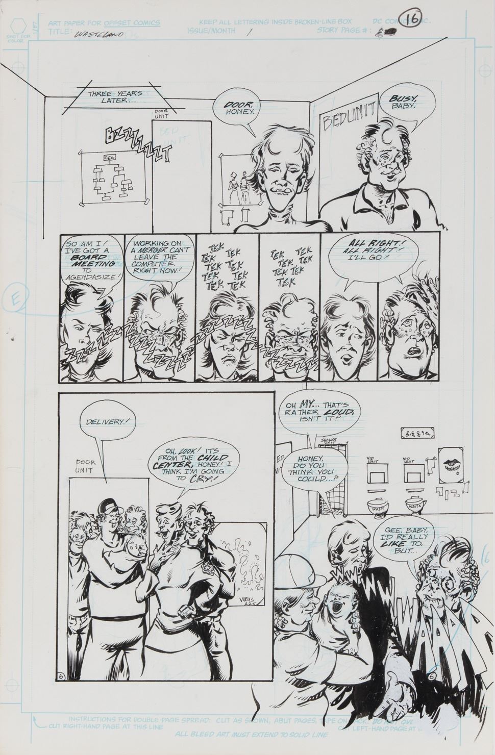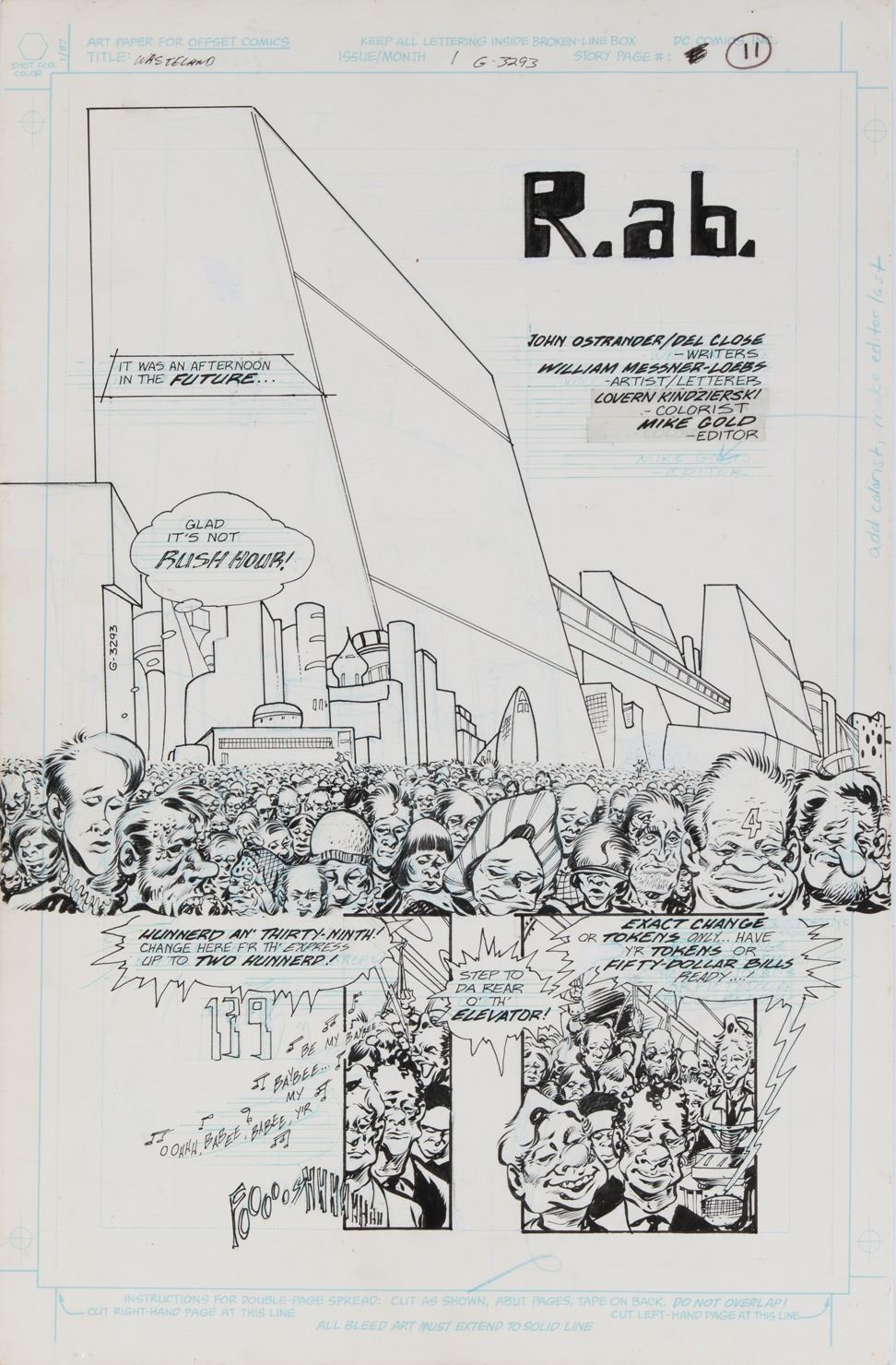 169. William Messner-Loeb original artwork for Wasteland #1 complete 9-page story "R.ab.". (DC, 1987) Accomplished in pen and ink on 13 x 19.5 in. From issue #1 of the critically acclaimed 1987 DC series Wasteland. "R.ab." features Messner-Loeb's dynamic story telling skills which are edgy, as befits a horror series, while also harkening back to traditional comics pacing. Rare to find a complete story available. In very good condition. $300 - $500